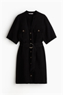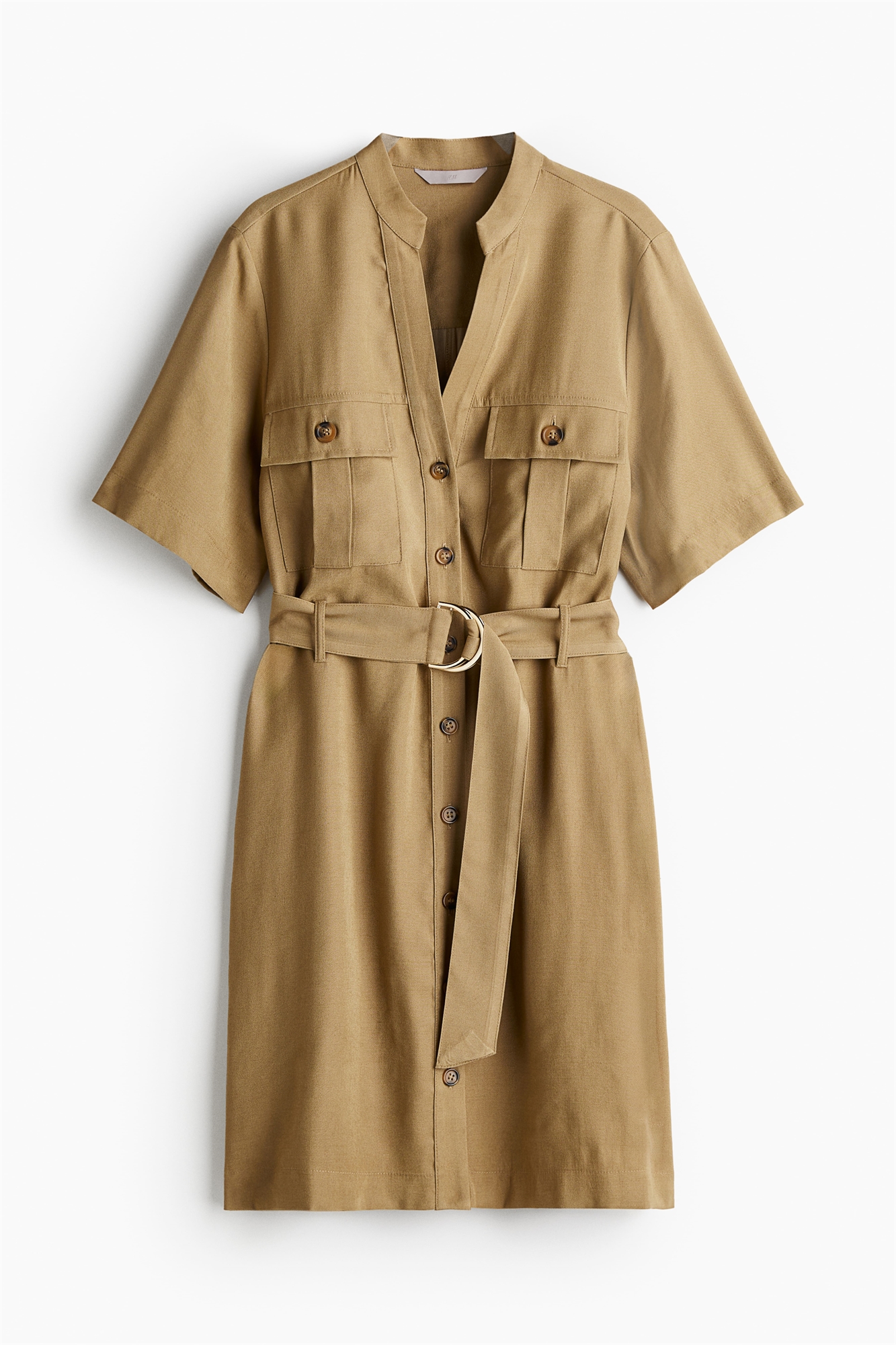 Короткое платье из саржи с воротником-бантом, V-образной проймой и пуговицами спереди. Короткие рукава, накладные нагрудные карманы с пуговицей и широкий съемный пояс с металлическими D-кольцами. Без подкладки.