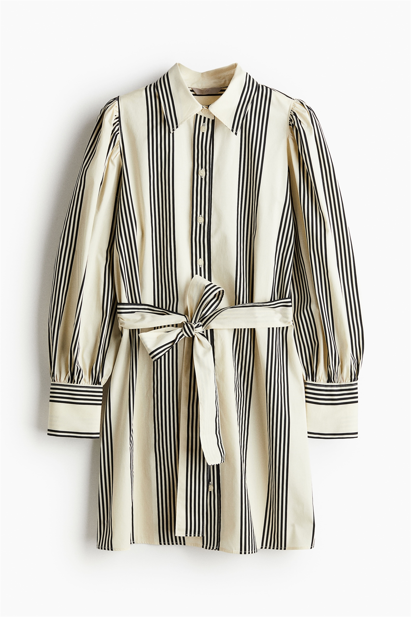 Короткое платье из хрустящего хлопкового поплина с воротником, пуговицами спереди и широким съемным поясом-галстуком на талии. Длинные рукава-баллоны с широкими манжетами на пуговицах. Без подкладки.