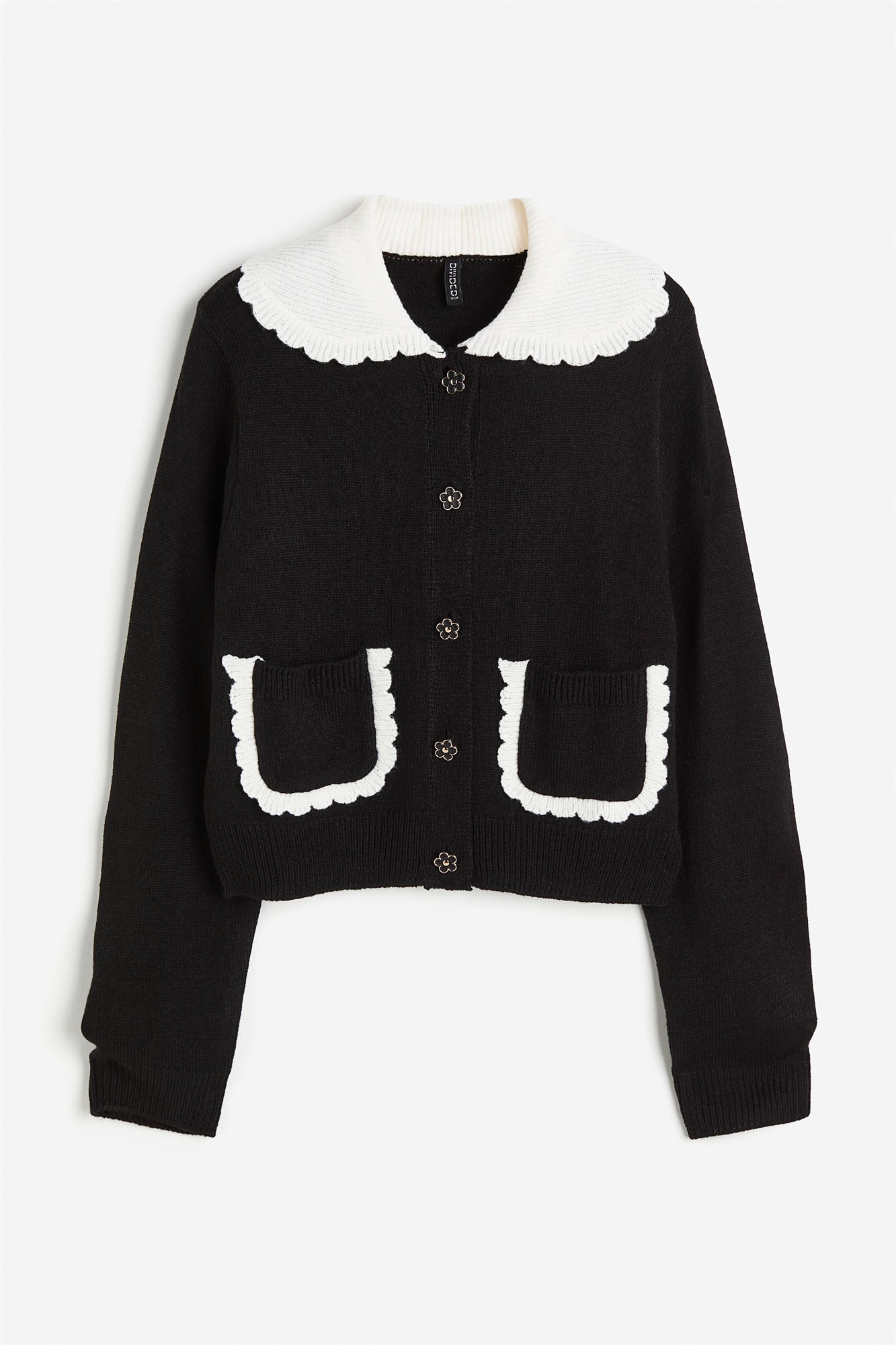 Кардиган из мягкого трикотажа с отложным воротником, пуговицами в форме цветка и накладными передними карманами. Зазубренные края воротника и карманов. Ребристая отделка на пуговицах, карманах, манжетах рукавов и подоле.