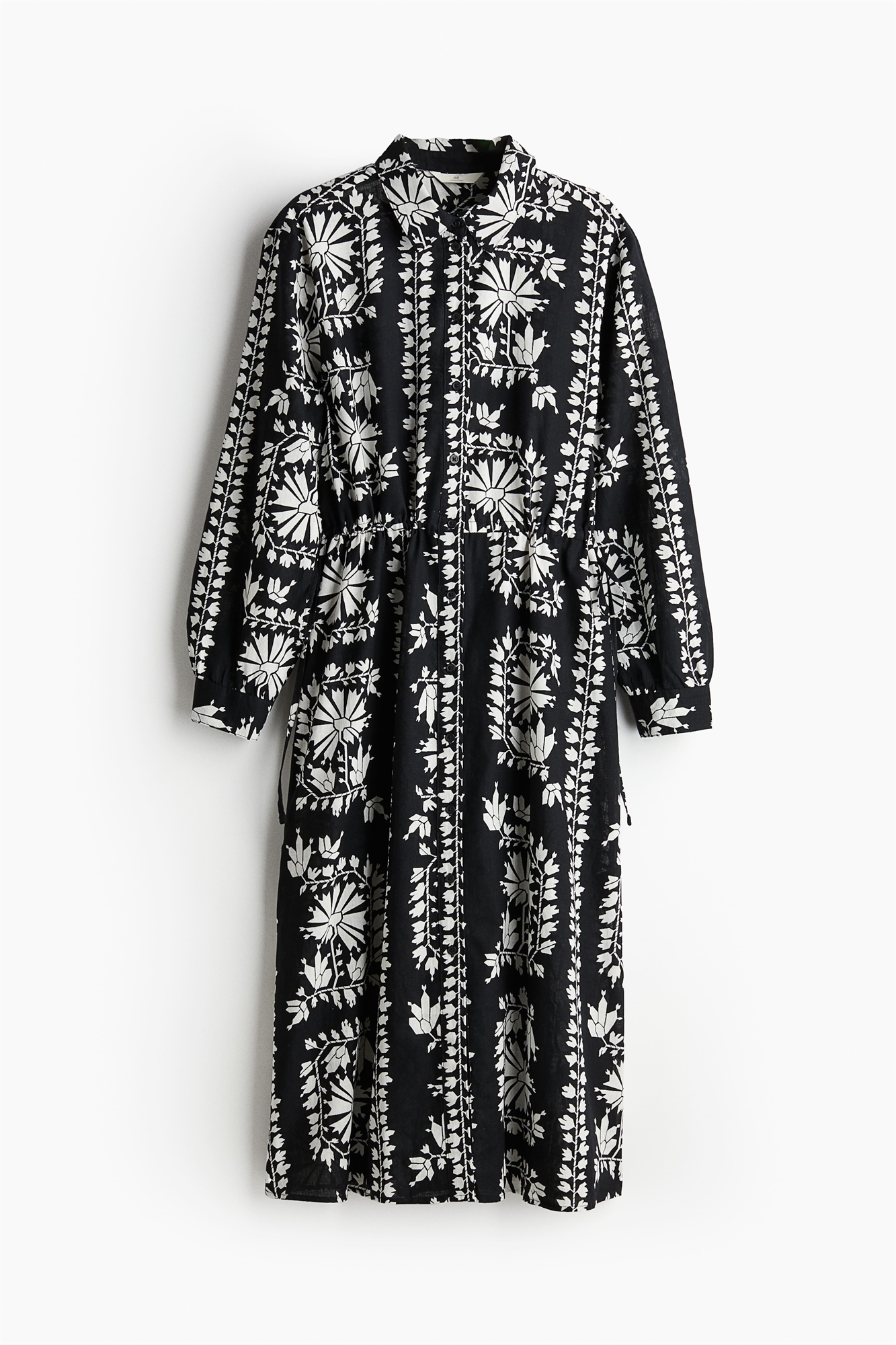 Платье-рубашка длиной до колен из смеси льна и хлопка с воздушным плетением. Воротник, застежка на пуговицы спереди, передняя часть и длинные рукава с манжетами на пуговицах. Узкие шнурки на талии, завязывающиеся по бокам, и подол прямого кроя с боковыми разрезами.
