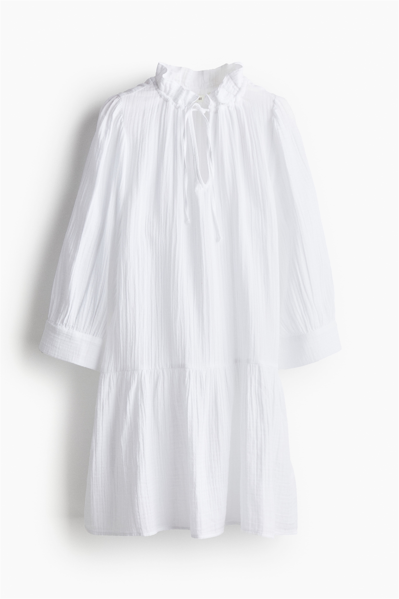 Короткое платье свободного покроя из хлопкового полотна с небольшим воротником с оборками и V-образной проймой с узким шнурком в верхней части. Длинные рукава-баллон с широкими манжетами и сборчатый шов над подолом для придания дополнительного объема. Без подкладки.