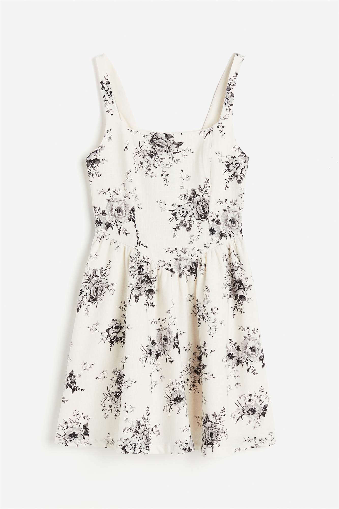 Короткое платье без рукавов из смеси льна и вискозы с воздушным переплетением. Приталенный лиф с платочной вставкой сзади, сборчатый шов на талии, изогнутый спереди, и расклешенная юбка. На подкладке.