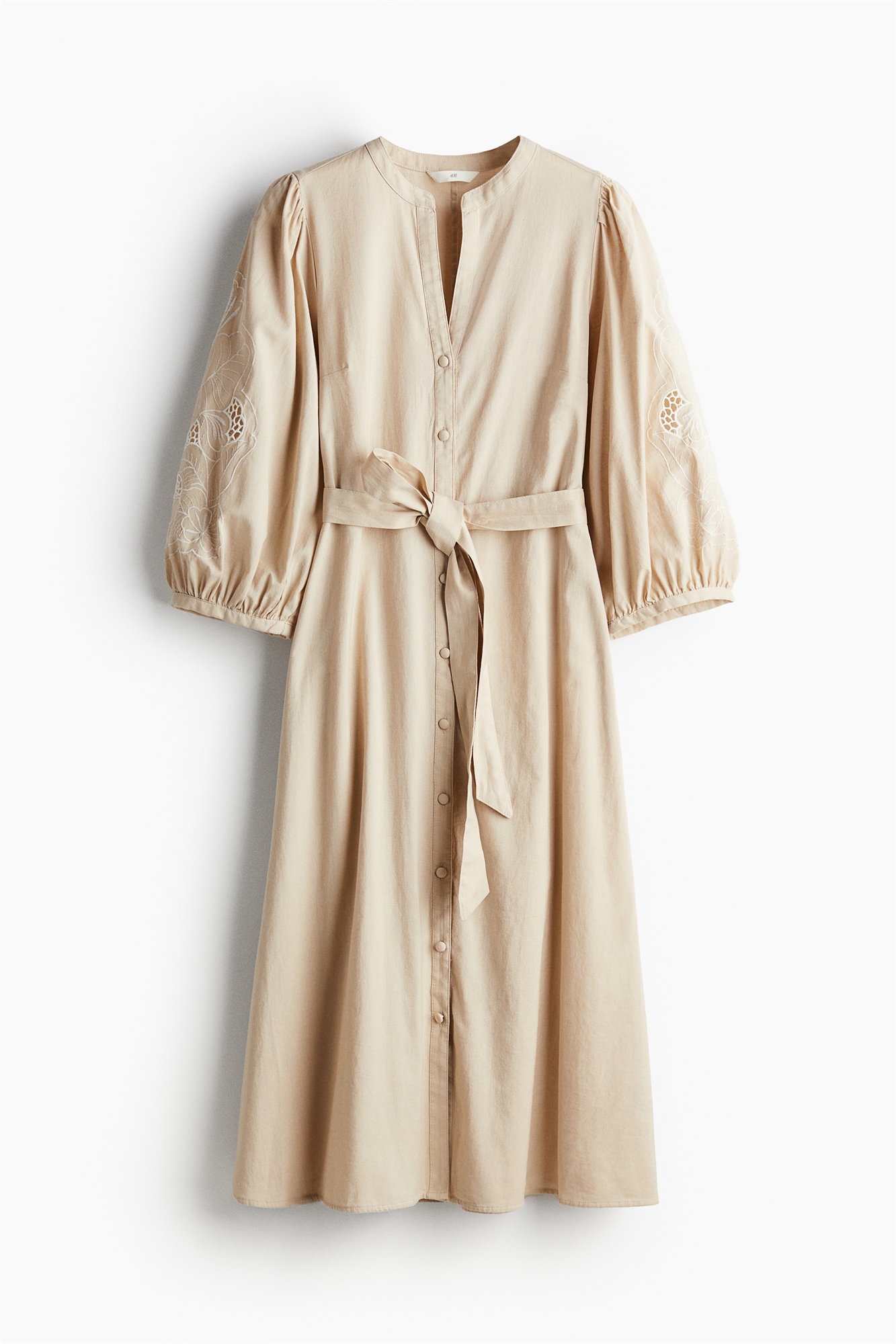 Платье из хлопка и льна длиной до колен с воротником-бантом, V-образной проймой в верхней части и закрытыми пуговицами спереди. Рукава-баллоны длиной 3/4 с вышивкой и узким кантом по подолу. Широкий съемный пояс-завязка на талии и расклешенная юбка. Без подкладки.