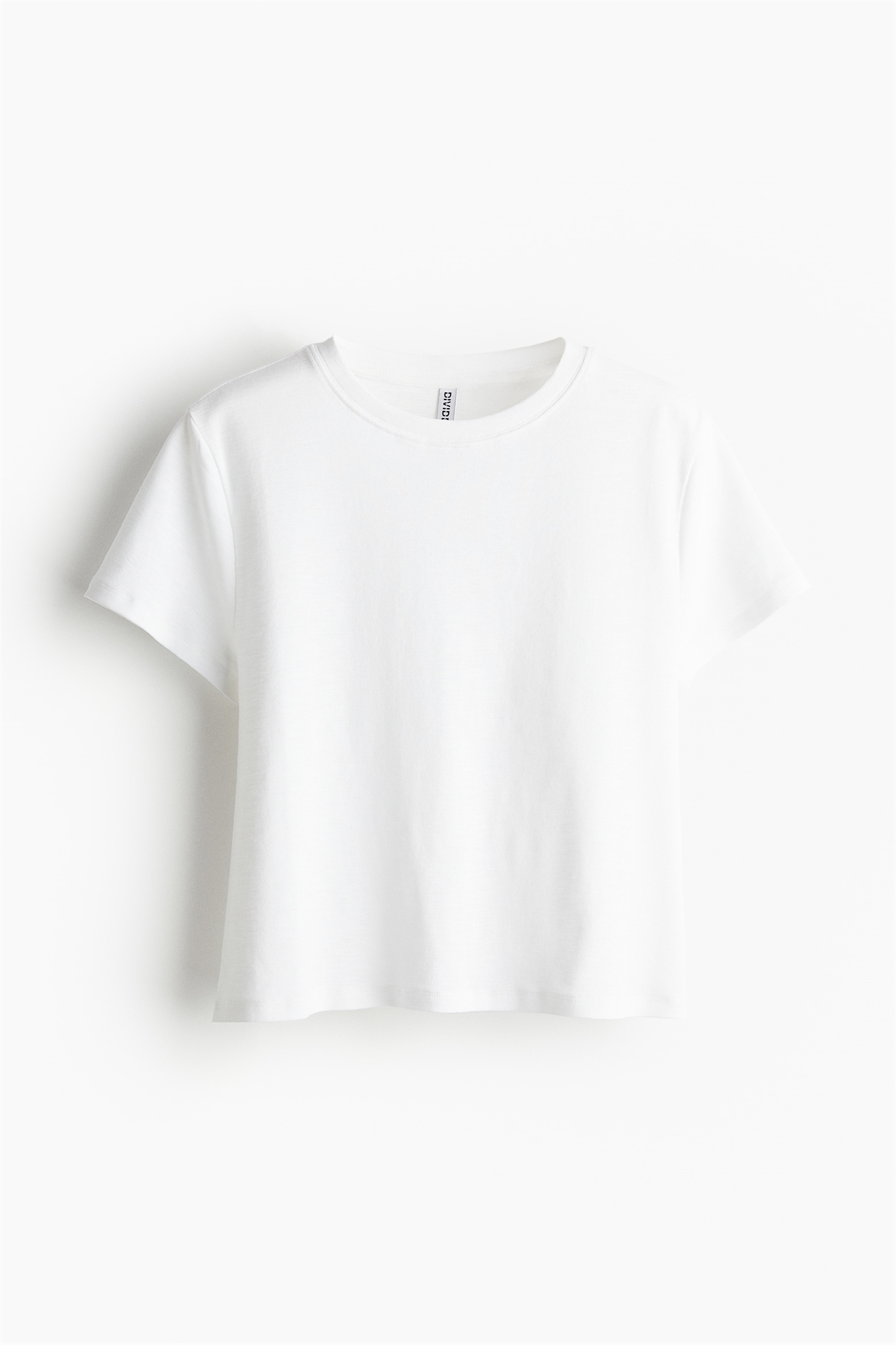 Футболка из мягкого трикотажа с ребристой отделкой по вырезу горловины и прямым кроем подола.