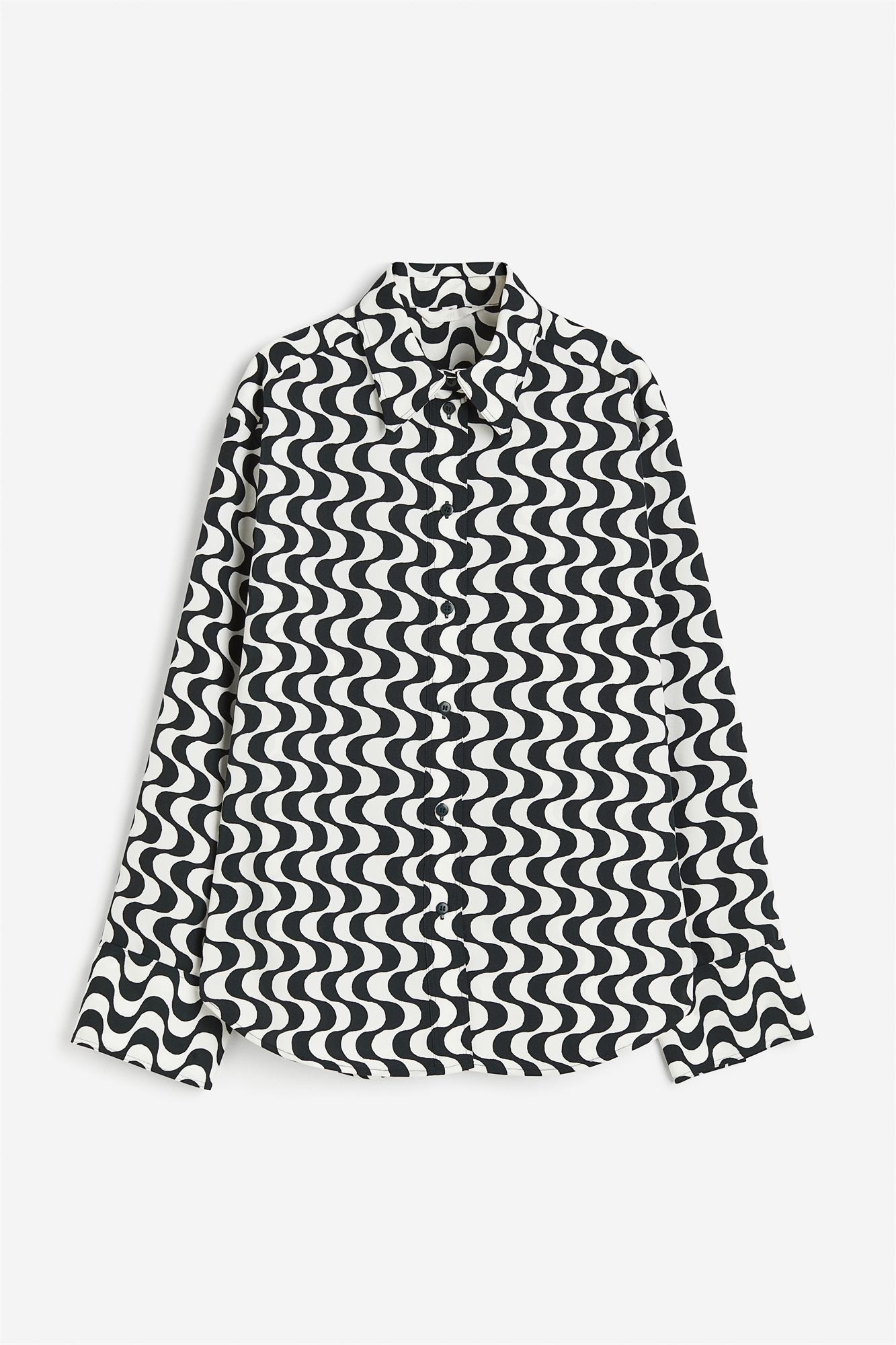 Блузка из саржи с воротником и застежкой на пуговицы. Двухслойная спинка, спущенные плечи и длинные рукава с манжетами на пуговицах. Закругленный подол.