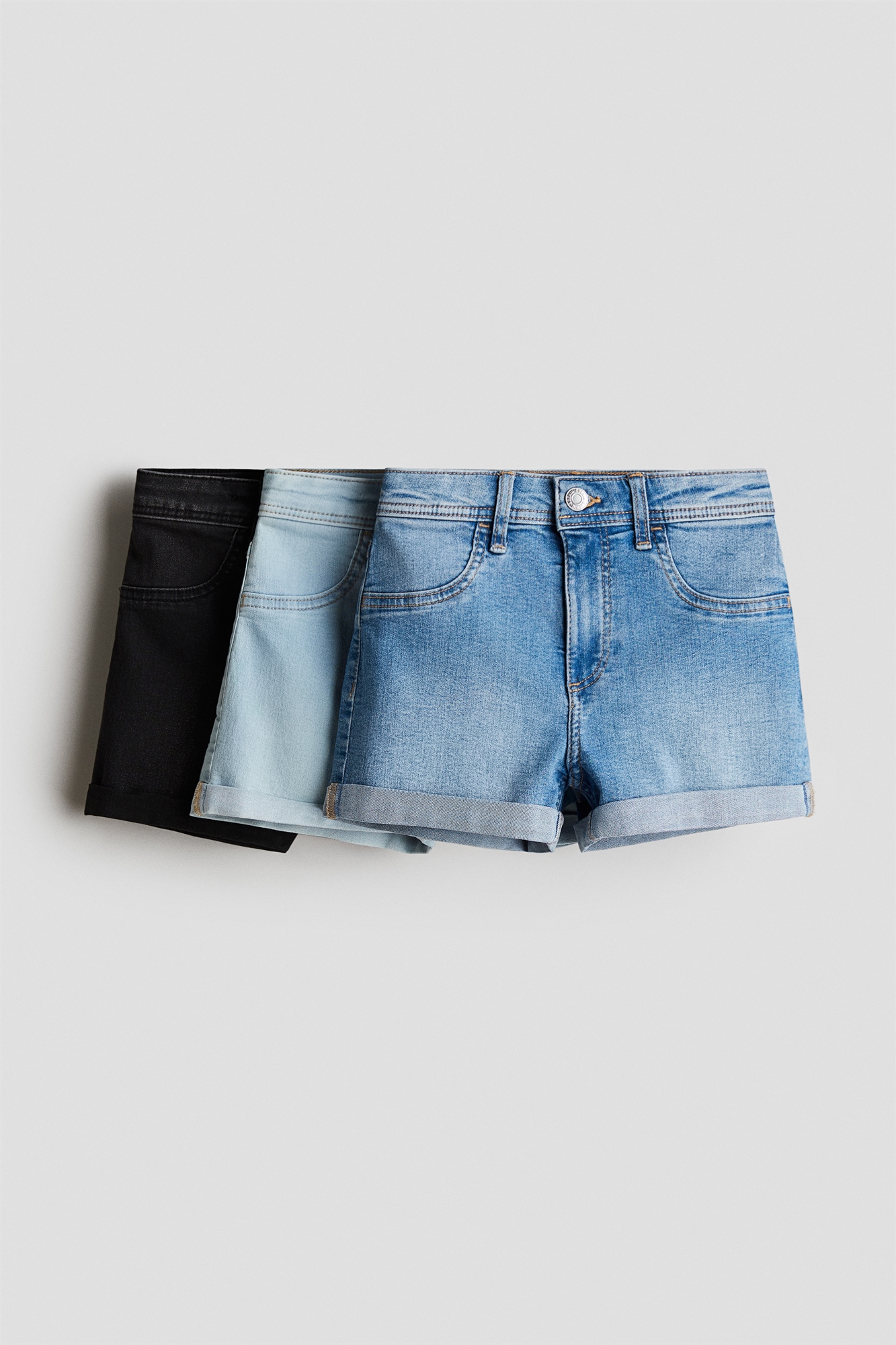 Облегающие шорты из денима с регулируемой резинкой на талии и ширинкой на молнии с пуговицей. Поддельные передние карманы, открытые задние карманы и вшитые подвороты по краям.