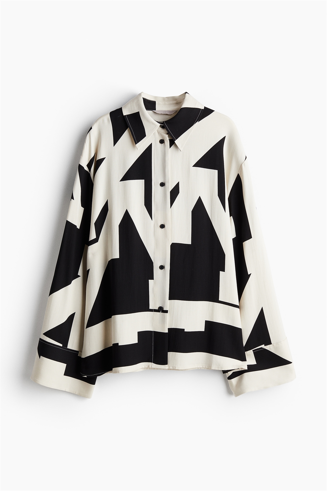 Свободная рубашка из тканого материала с заостренным воротником, застежкой на пуговицы спереди, спущенными плечами и длинными рукавами с манжетами на пуговицах и рукавной планкой с пуговицей. Подол прямого кроя.