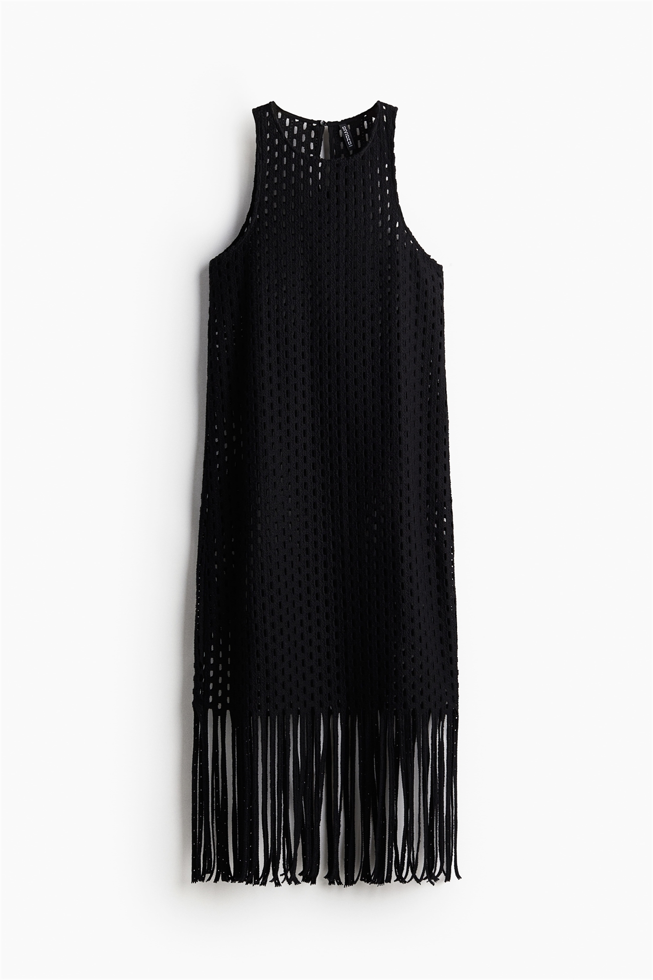Платье без рукавов длиной до колен из мягкого трикотажа с круглым вырезом и отверстием для ключа с пуговицей сзади на шее. Длинная бахрома по подолу. Без подкладки.