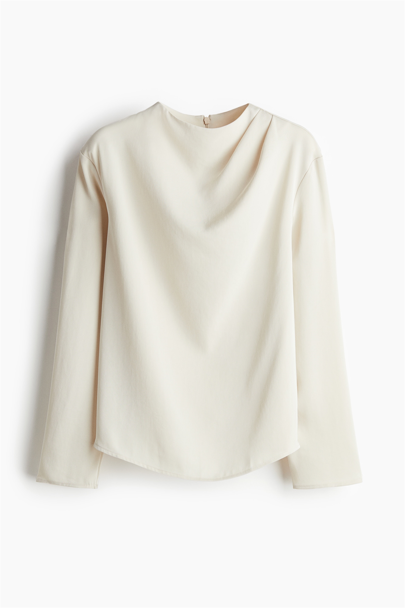 Блузка из саржи с облегающим вырезом и складками на одном плече, которые создают мягкую драпировку спереди. Слегка спущенные плечи и длинные рукава с широкими манжетами на пуговицах. Аккуратный закругленный подол.