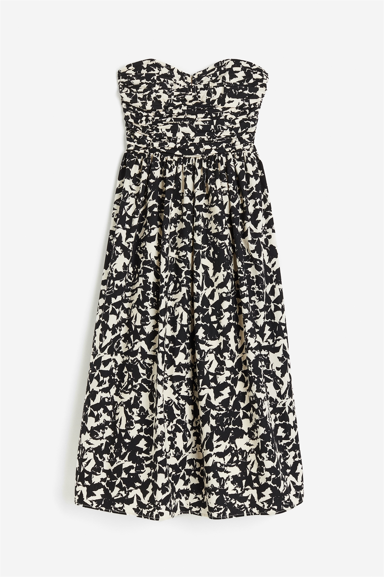 Платье-бандо длиной до щиколоток из хлопка с узорчатым переплетением. Облегающий лиф с вырезом в форме сердца, небольшой V-образной проймой с потайной проволокой по центру бюста, косточками по бокам и потайной застежкой-молнией сзади. Расклешенная юбка с прямым подолом. На подкладке.