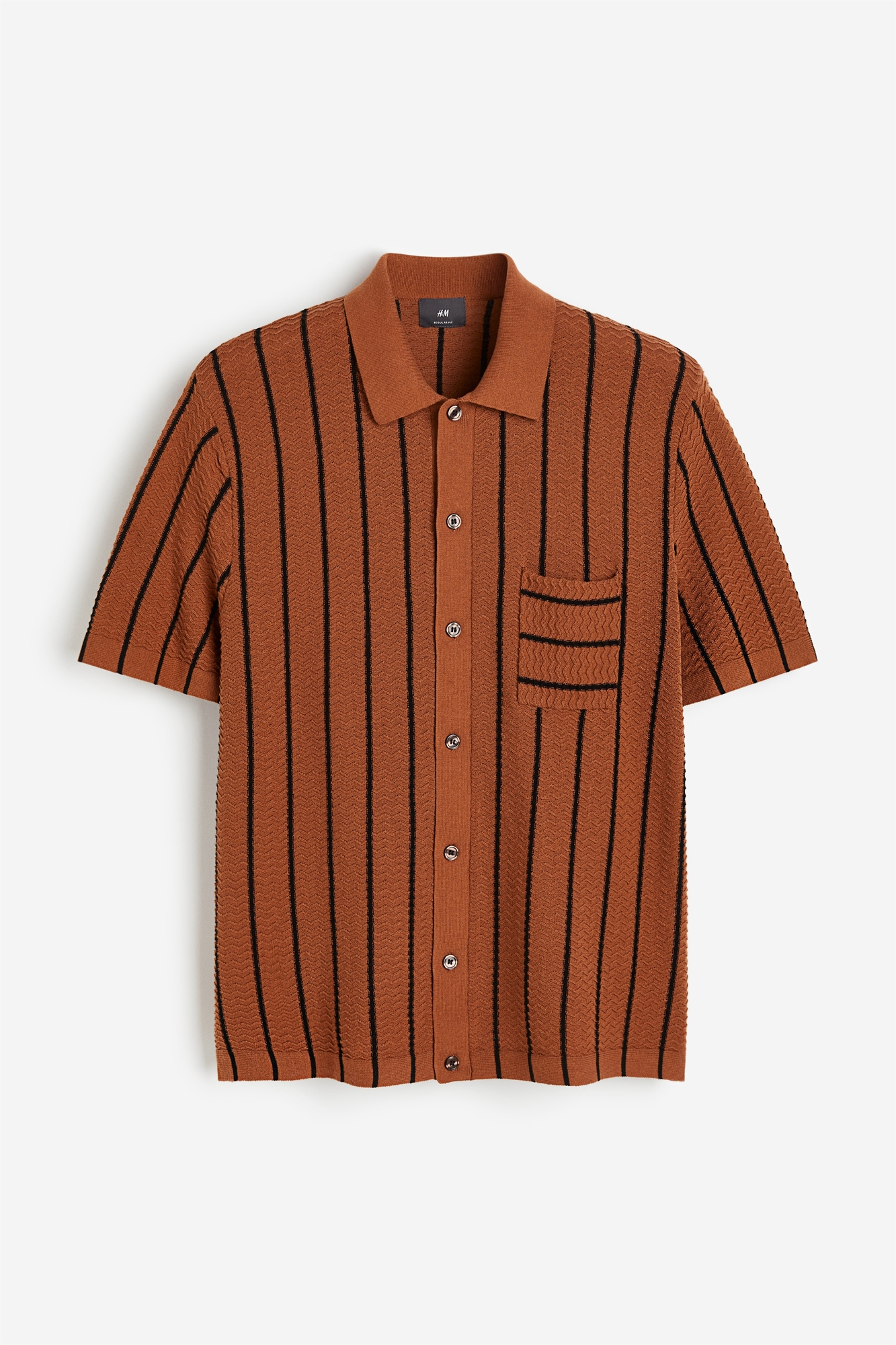 Рубашка с короткими рукавами из фактурного трикотажного хлопка с воротником, классическим передом, открытым нагрудным карманом и прямым подолом. Регулярный крой для комфортной носки и классического силуэта.