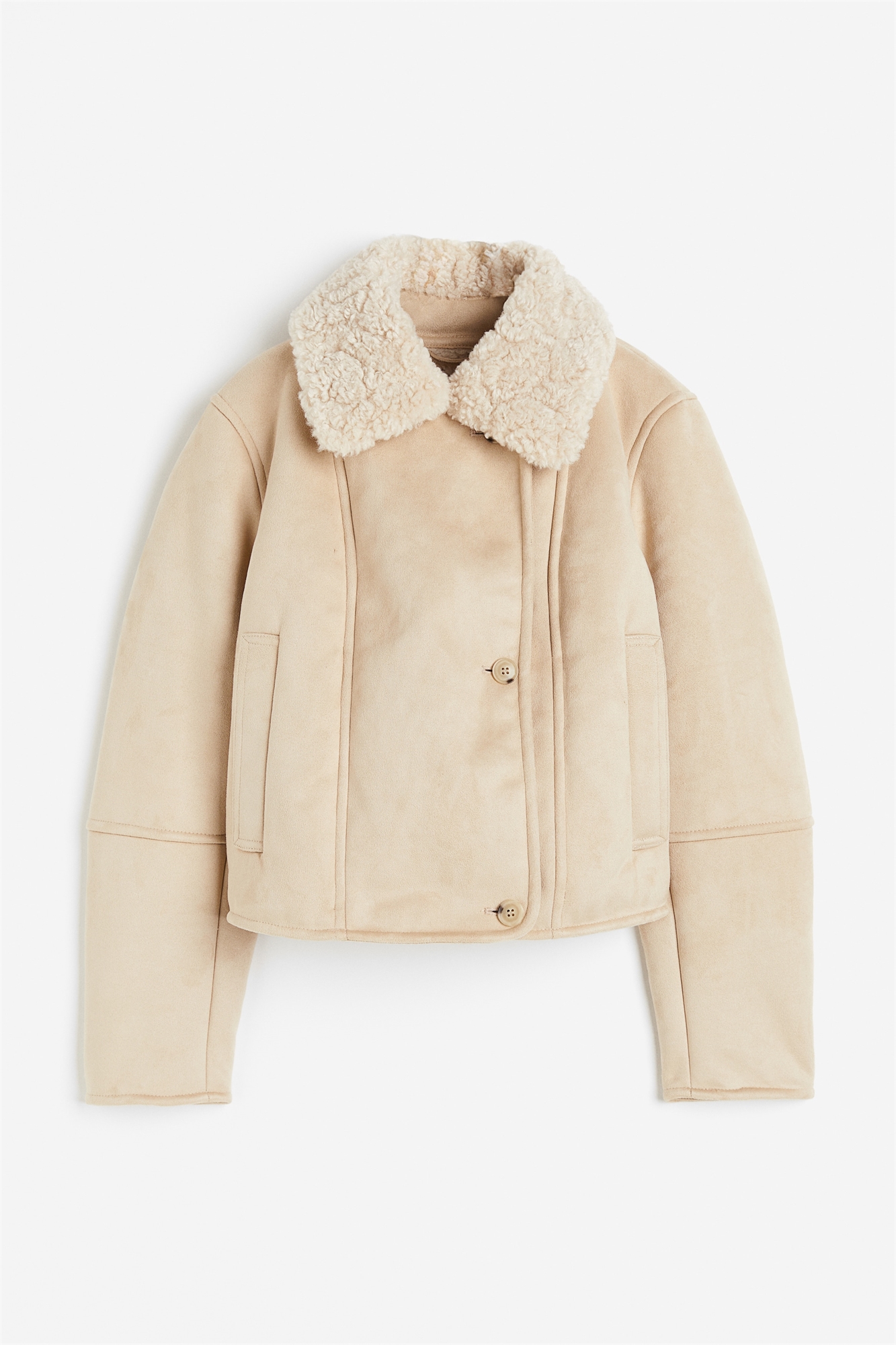 Куртка из мягкой ворсистой ткани с воротником и подкладкой из мягкого тедди. Заворачивающаяся передняя часть с пуговицами, втачные передние карманы и длинные, слегка сужающиеся рукава с видимыми швами на локтях.