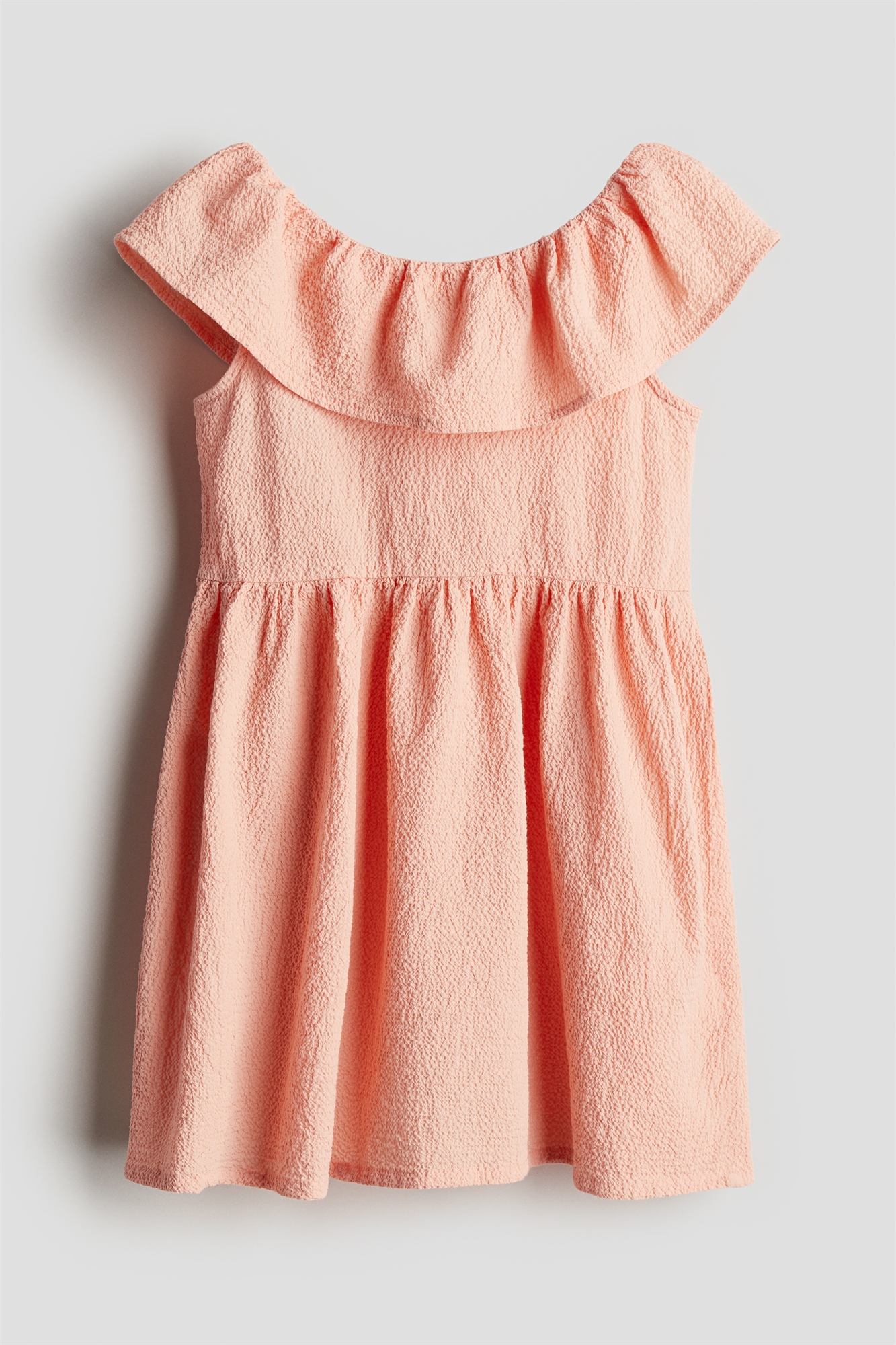 Платье из тканого материала с принтом на всю фигуру и широким воланом вокруг выреза, который также закрывает плечи. Пуговицы сзади и сборчатый шов на талии. Без подкладки.