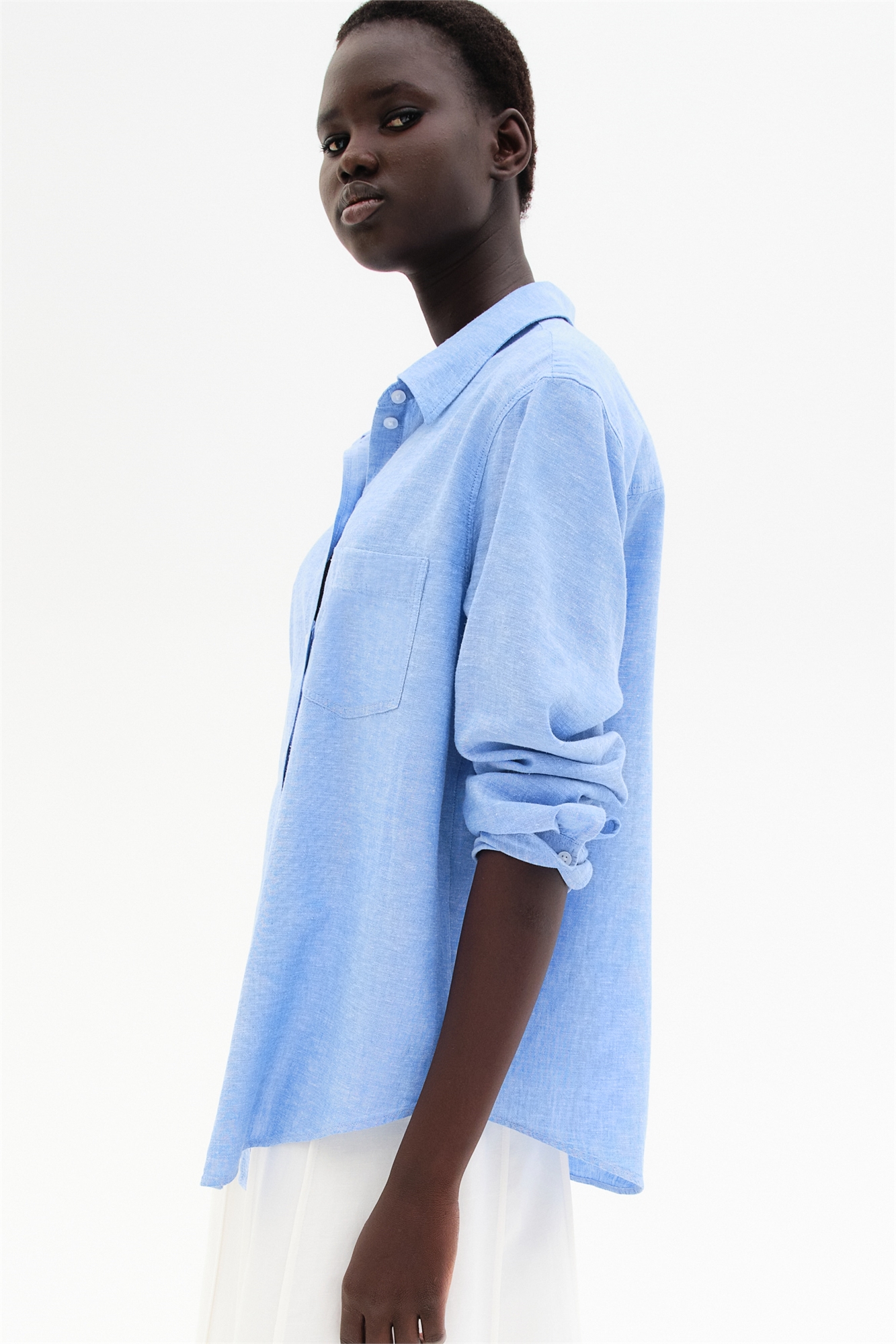 Рубашка с воздушным переплетением из смеси льна и вискозы. Воротник, пуговицы спереди, открытый нагрудный карман и двухслойный ярмо с коробчатой складкой сзади. Длинные рукава с манжетами на пуговицах. Закругленный подол.