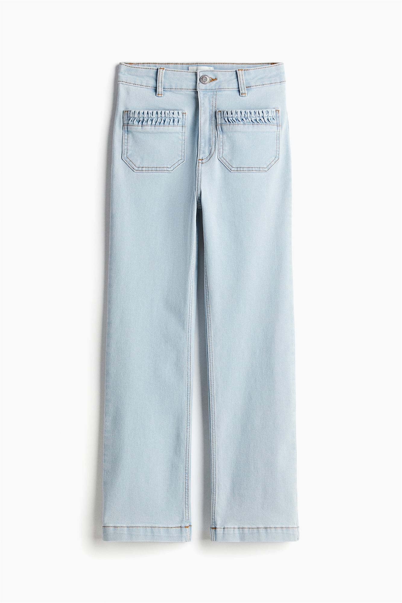 Джинсы из денима, который слегка тянется, обеспечивая легкость движений, но при этом надежно держит форму на ногах. Расклешенные штанины с зауженной посадкой от талии до бедра и расклешенным кроем от колена до подола. Высокая талия, ширинка на молнии и пуговице, накладные задние карманы и передние карманы с плетеной деталью в верхней части. Обрезанная длина, созданная для того, чтобы задеть косточку над лодыжкой и показать лодыжку.