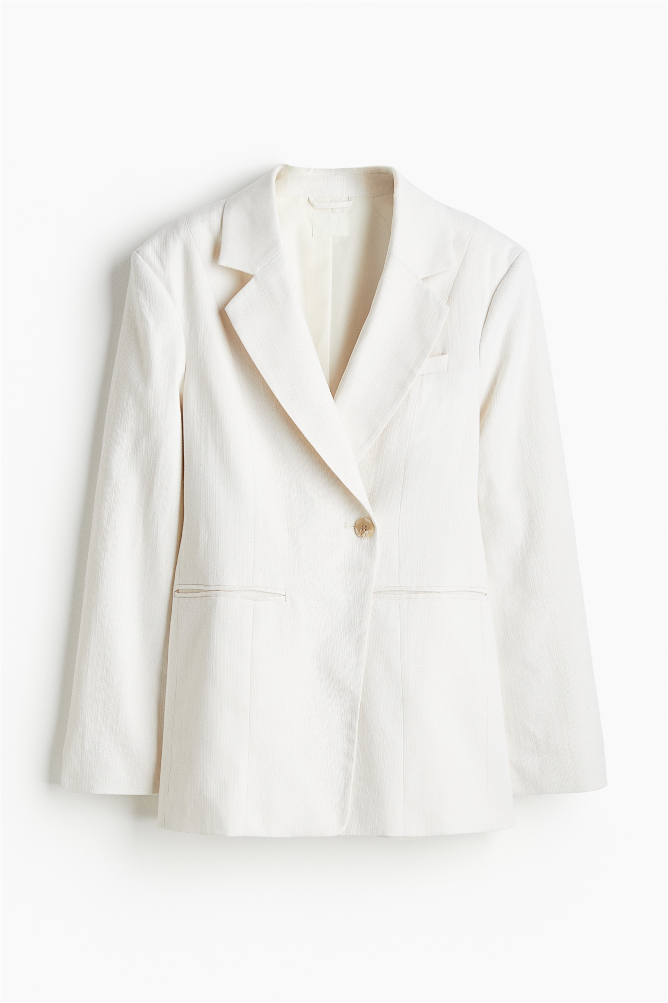 Однобортный блейзер из смеси льна и хлопка с легкой структурой. Приталенный фасон с воротником с лацканами и фигурными вытачками спереди и сзади. Один накладной карман на груди и прорезные карманы спереди. Накладки на плечах и длинные рукава с разрезами. На подкладке.
