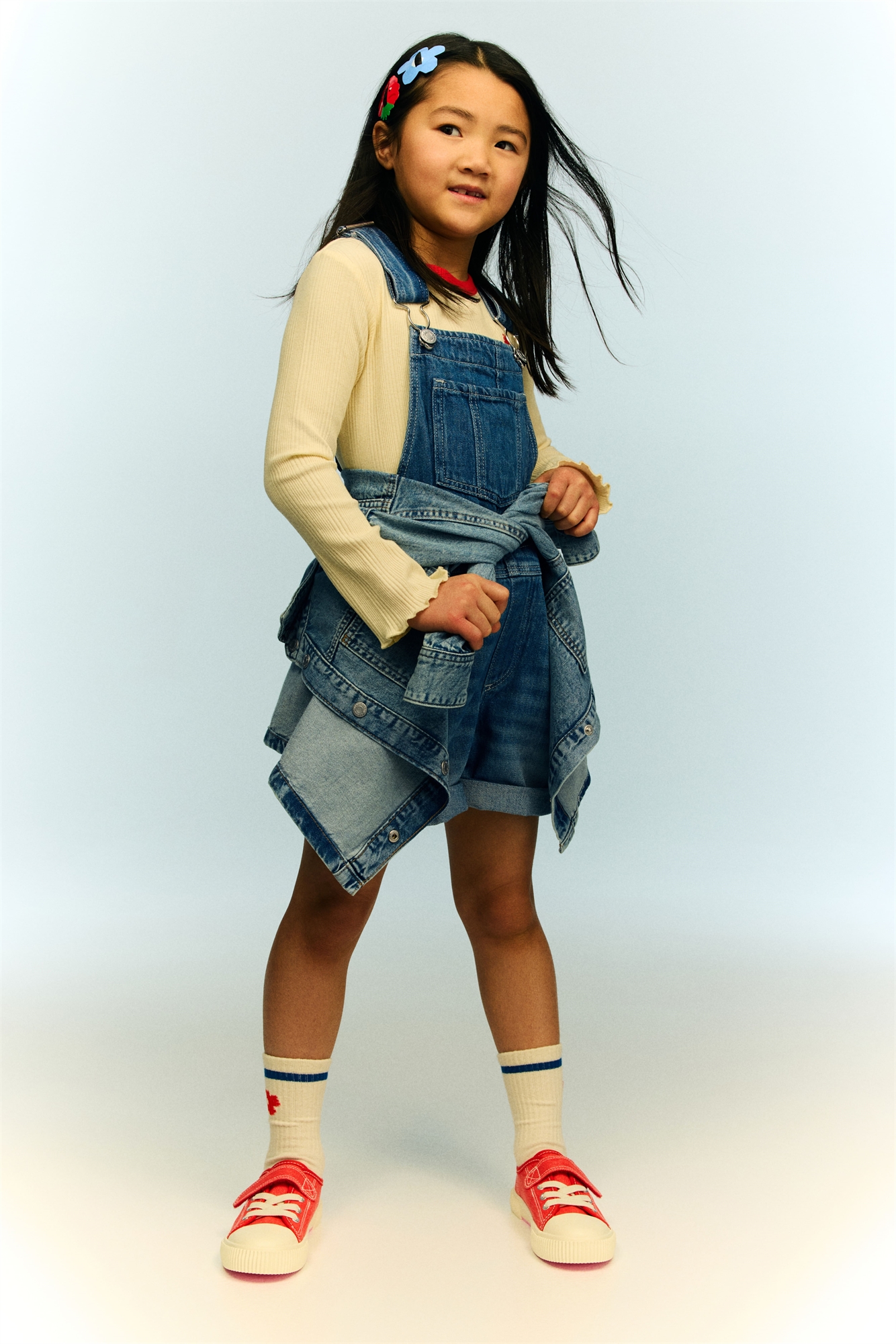 Шорты-дангари из моющегося хлопкового денима с регулируемыми бретелями, открытым нагрудным карманом, диагональными боковыми карманами и открытыми задними карманами. Застежки по бокам и фальшивая ширинка.