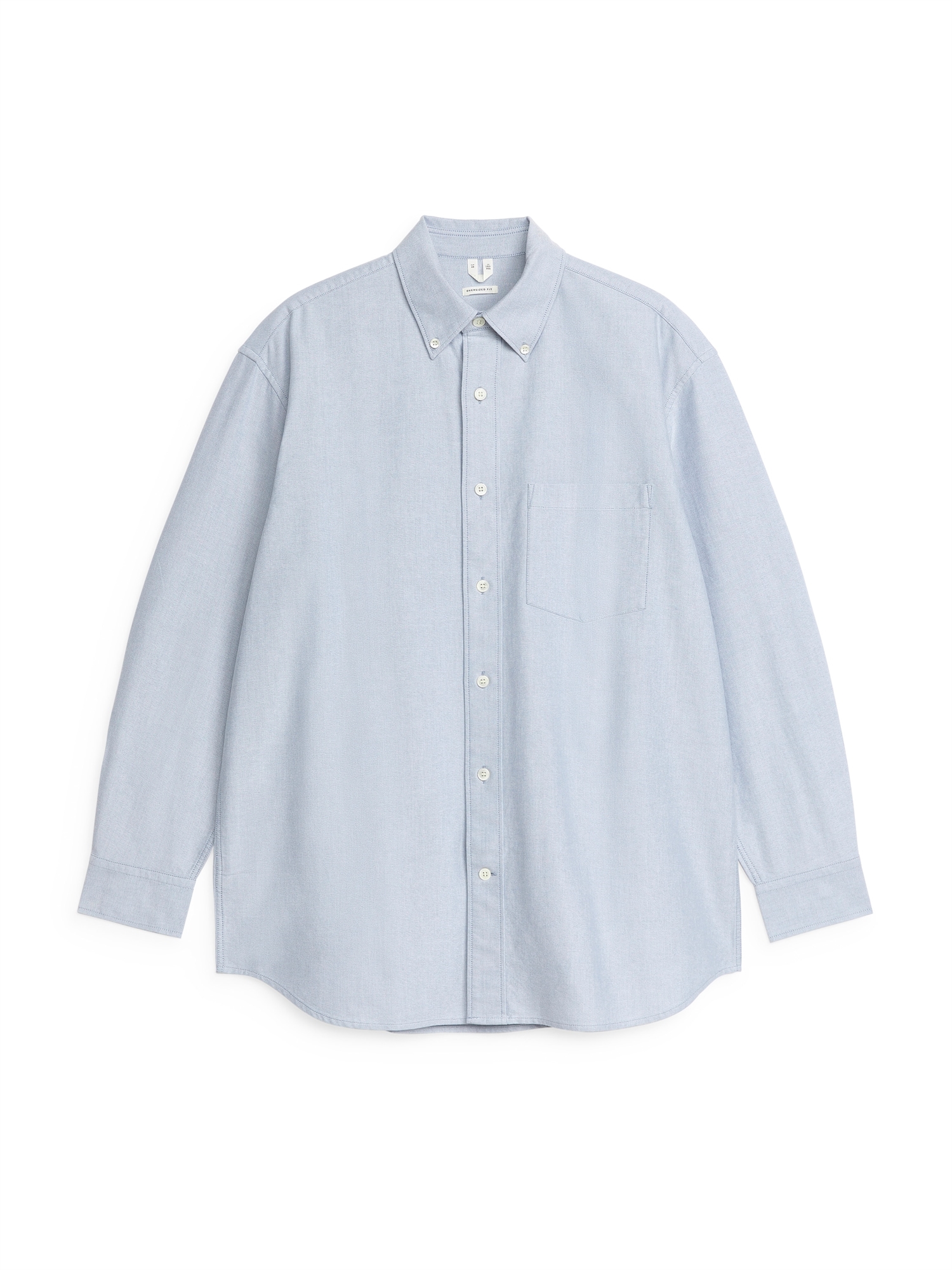 Рубашка из американского оксфорда с завышенной посадкой. Воротник на пуговицах, застежка на пуговицах спереди и один нагрудный карман. Изогнутая линия подола. Перламутровые пуговицы, что означает, что этот продукт содержит материал животного происхождения.