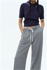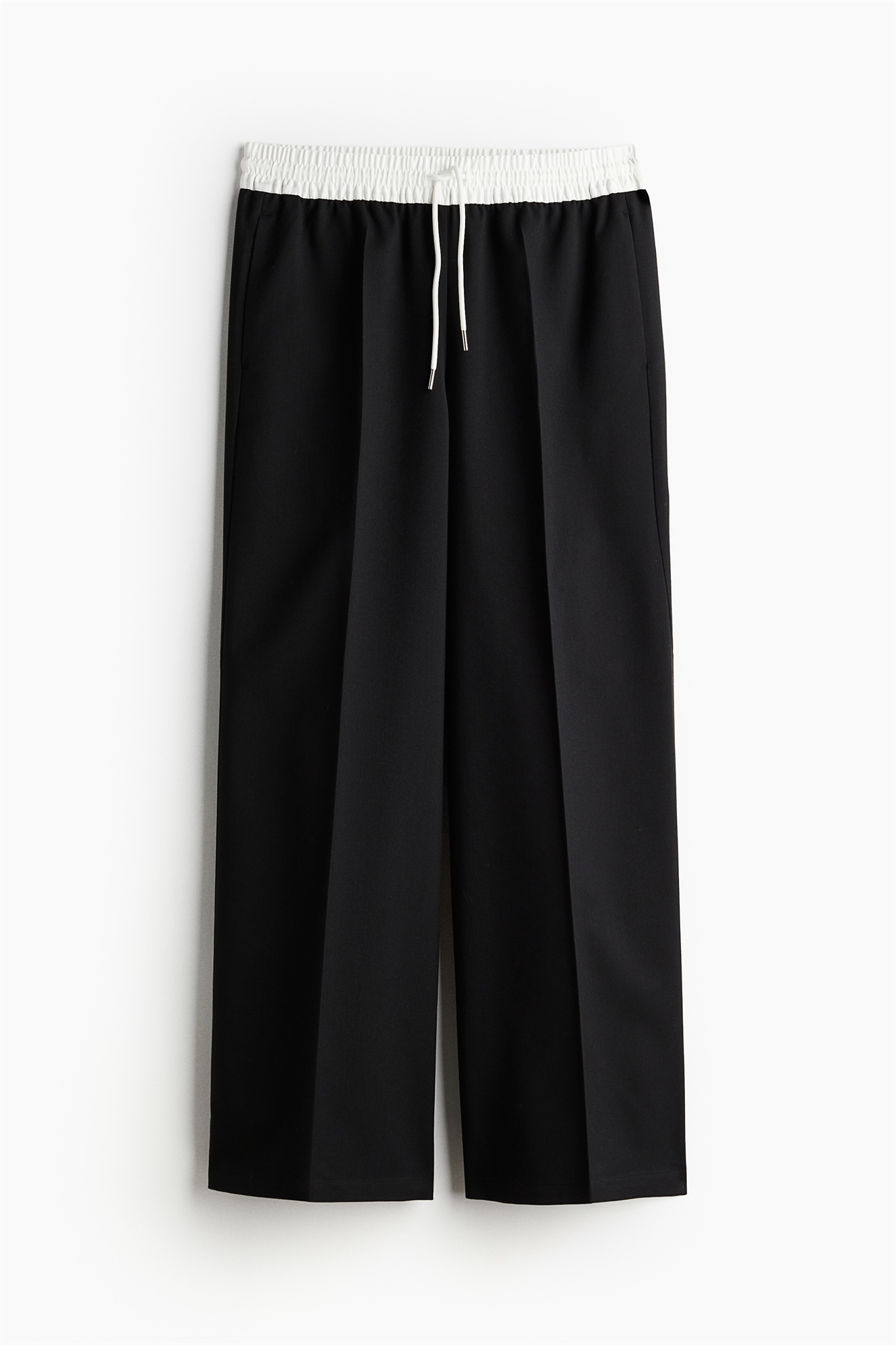 Брюки с эластичным поясом и утягивающим шнурком на талии. Небрежные карманы в боковых швах, фальшивые карманы сзади и широкие штанины.