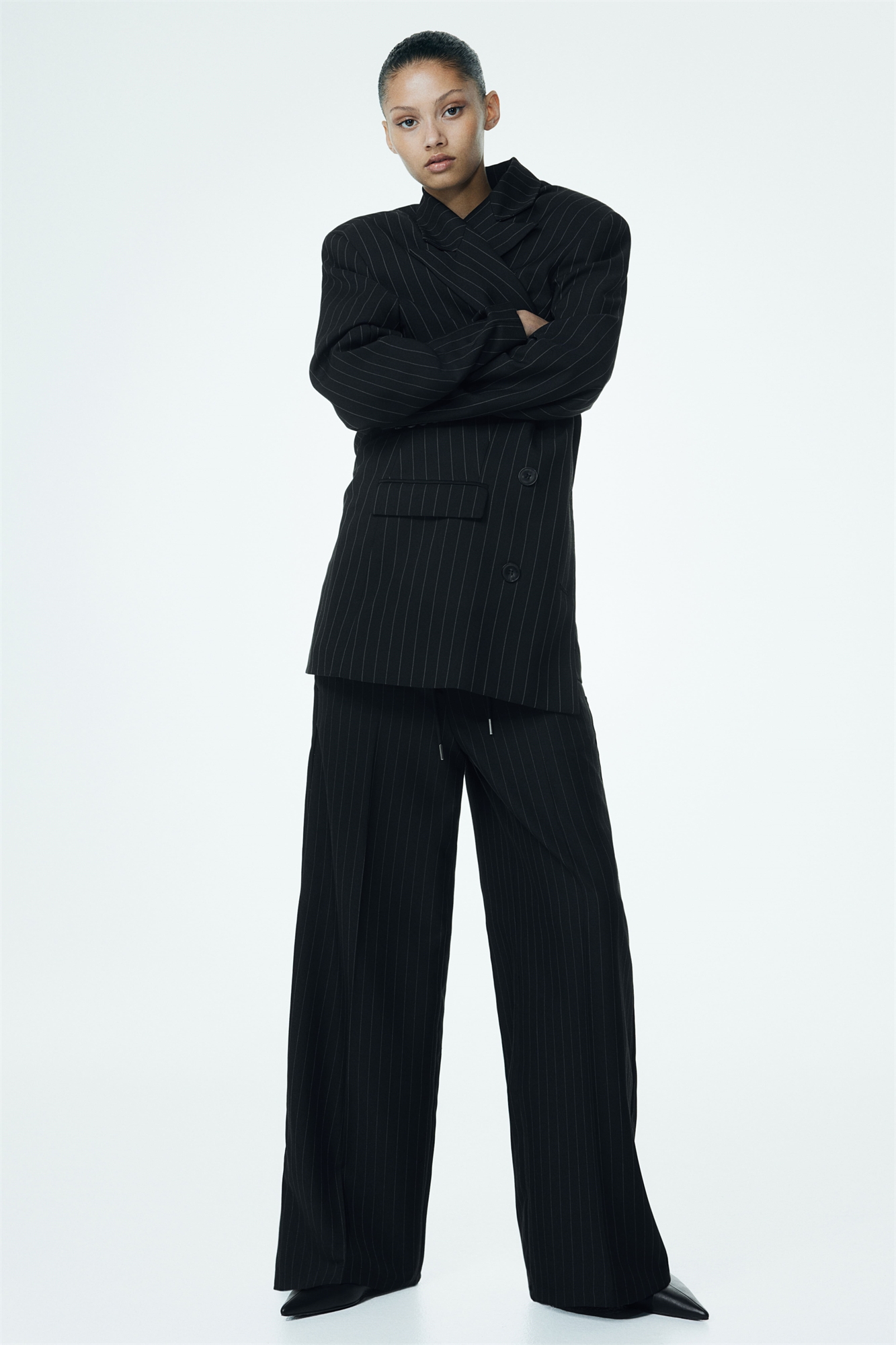 Брюки с эластичным поясом и утягивающим шнурком на талии. Небрежные карманы в боковых швах, фальшивые карманы сзади и широкие штанины.
