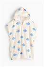 Накидка для полотенца из мягкой хлопковой махры с велюром на внешней стороне. Капюшон с аппликацией и открытые бока с узкими завязками.