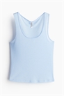 Короткая, приталенная майка из гладкого ребристого трикотажа с глубоким круглым вырезом и прямым подолом.