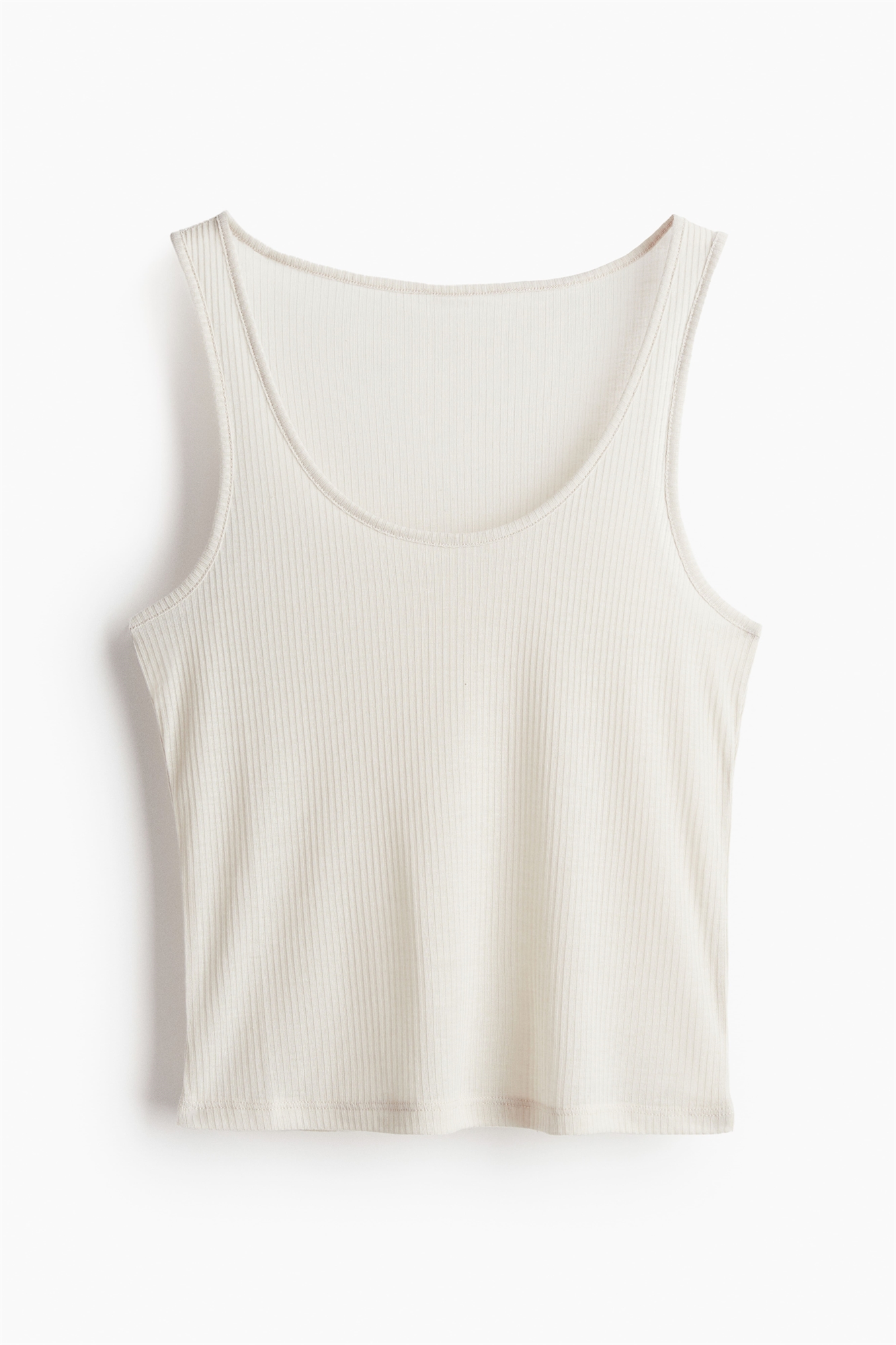Короткая, приталенная майка из гладкого ребристого трикотажа с глубоким круглым вырезом и прямым подолом.