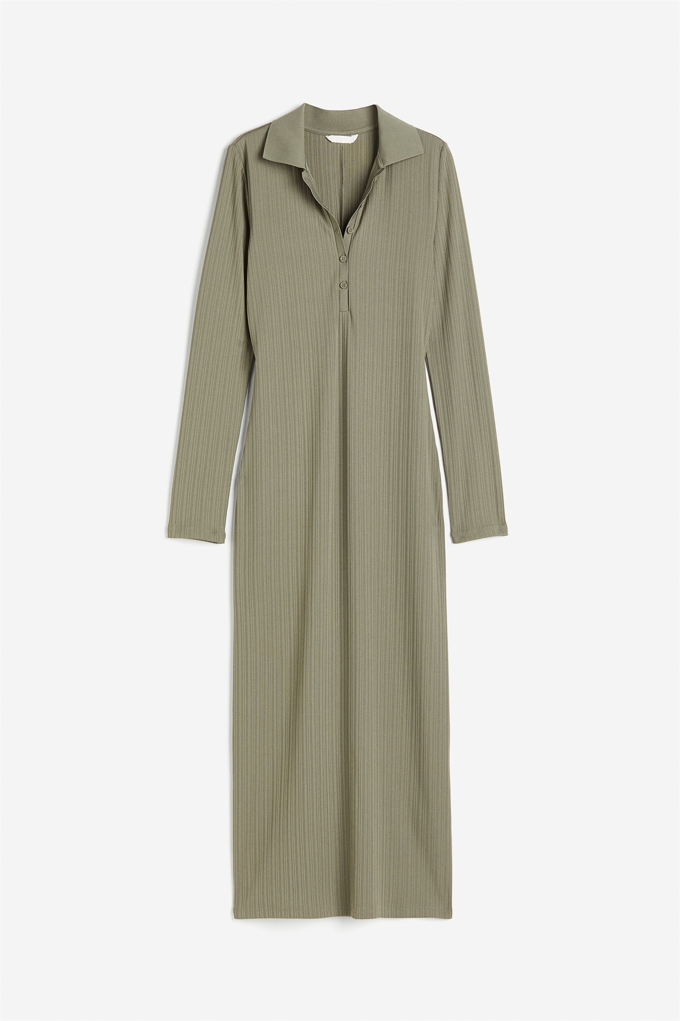 Приталенное платье длиной до колен из мягкого ребристого джерси с воротником и пуговицами в верхней части. Длинные рукава и прямой подол с разрезом сзади.