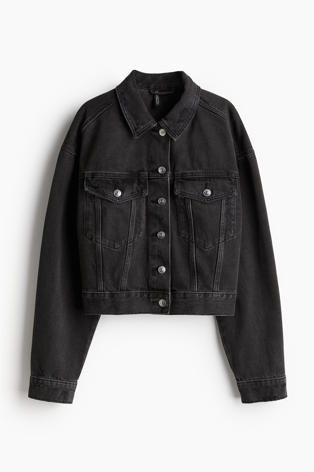 Короткая куртка в стиле дальнобойщика из жесткого хлопкового денима с воротником, металлическими пуговицами спереди, направленными вперед плечевыми швами и ярмом сзади. Свободный крой с опущенными плечами, манжеты на пуговицах и накладные нагрудные карманы с пуговицей.