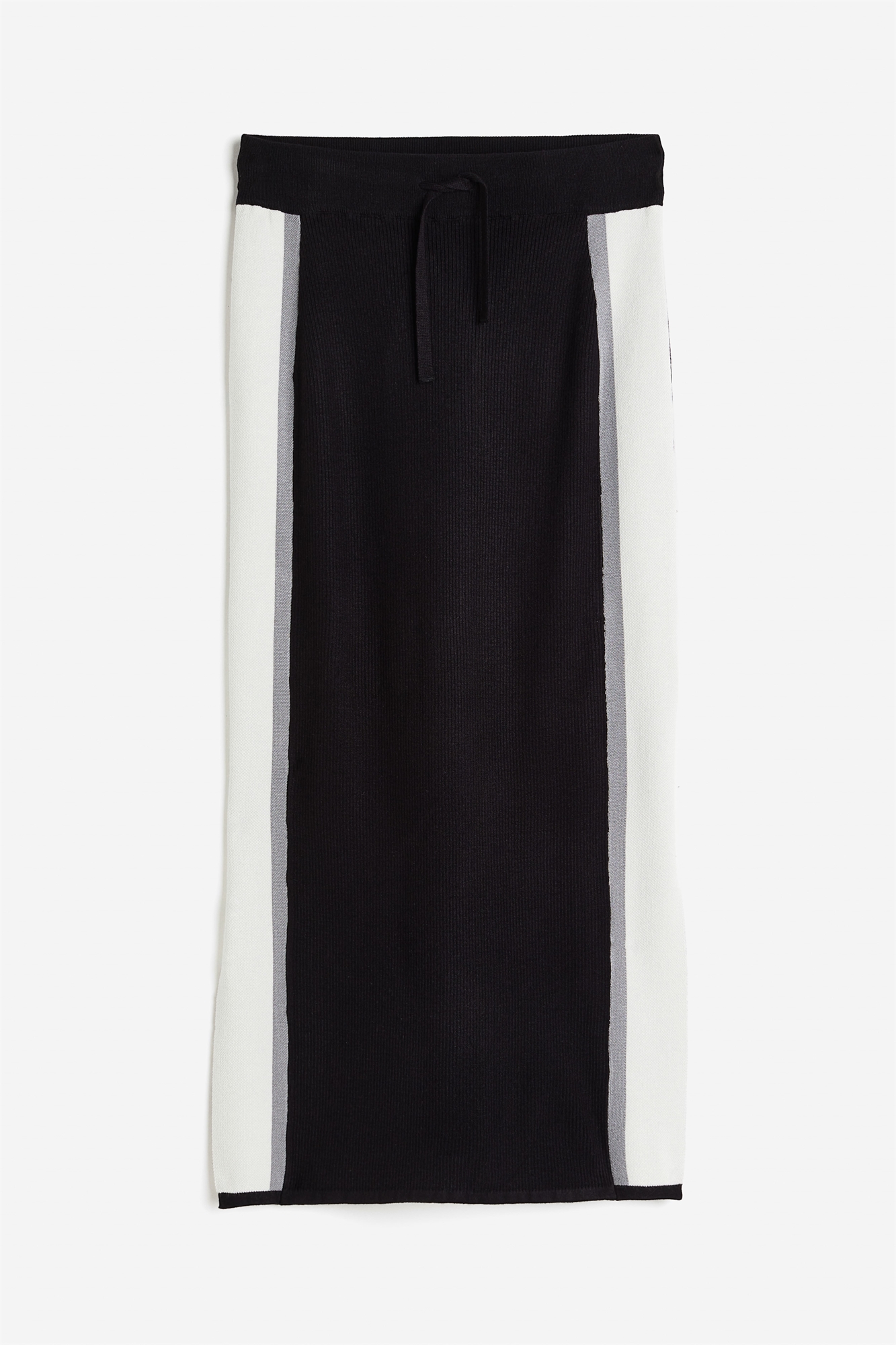 Юбка-карандаш спортивного стиля длиной до колен из мягкого трикотажа с ребристым поясом с утягивающим шнурком. Прямой подол с высоким разрезом с каждой стороны.