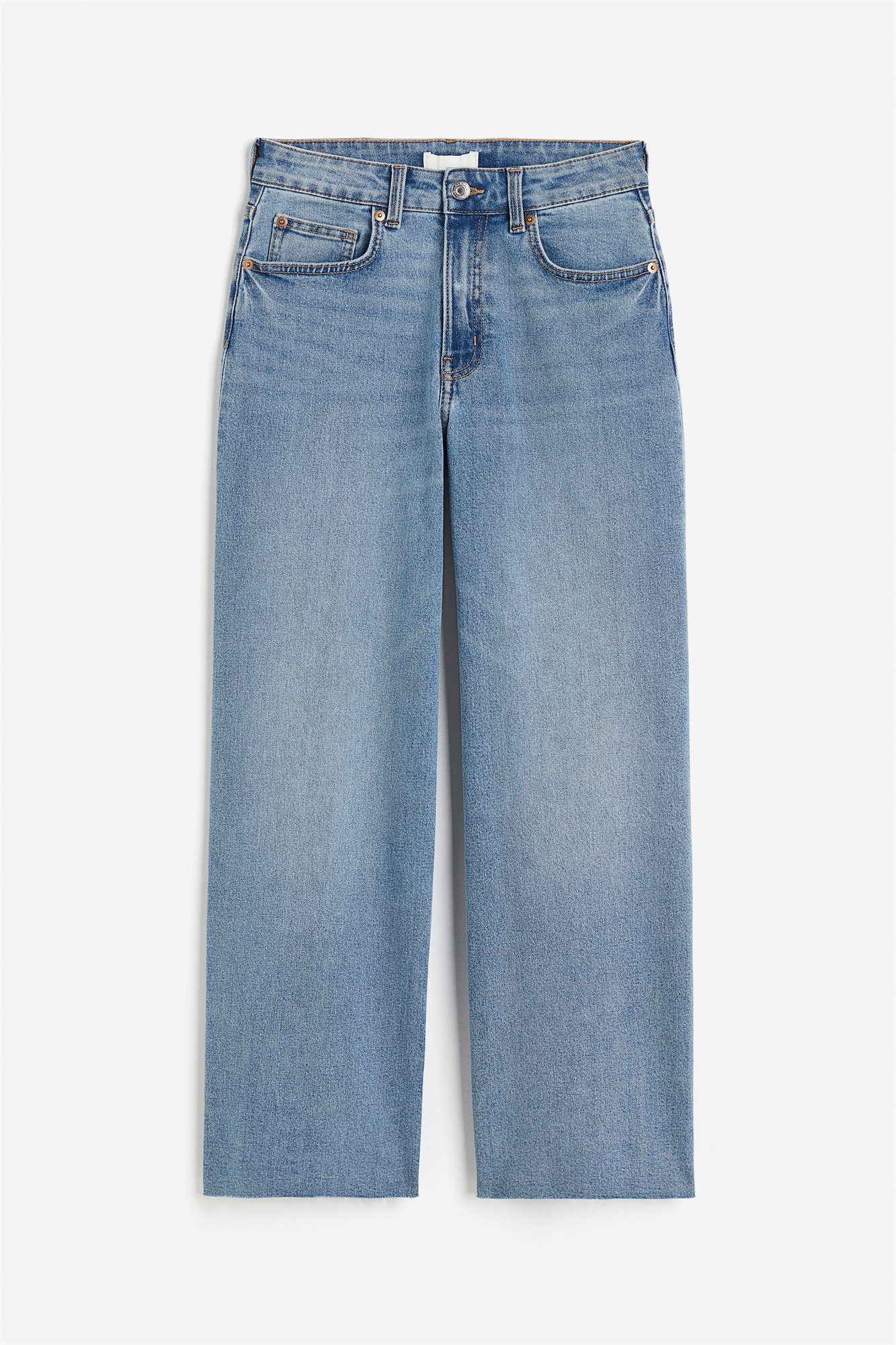 Джинсы с 5 карманами из хлопкового денима, который слегка тянется, обеспечивая легкость движений, но при этом надежно держит форму на ногах. Широкие штанины с обычной посадкой от талии до бедер и прямым, широким кроем от бедра до подола. Высокая талия с ширинкой на молнии и пуговице и необработанный подол. Длина по щиколотку, рассчитанная на ношение в области лодыжек.