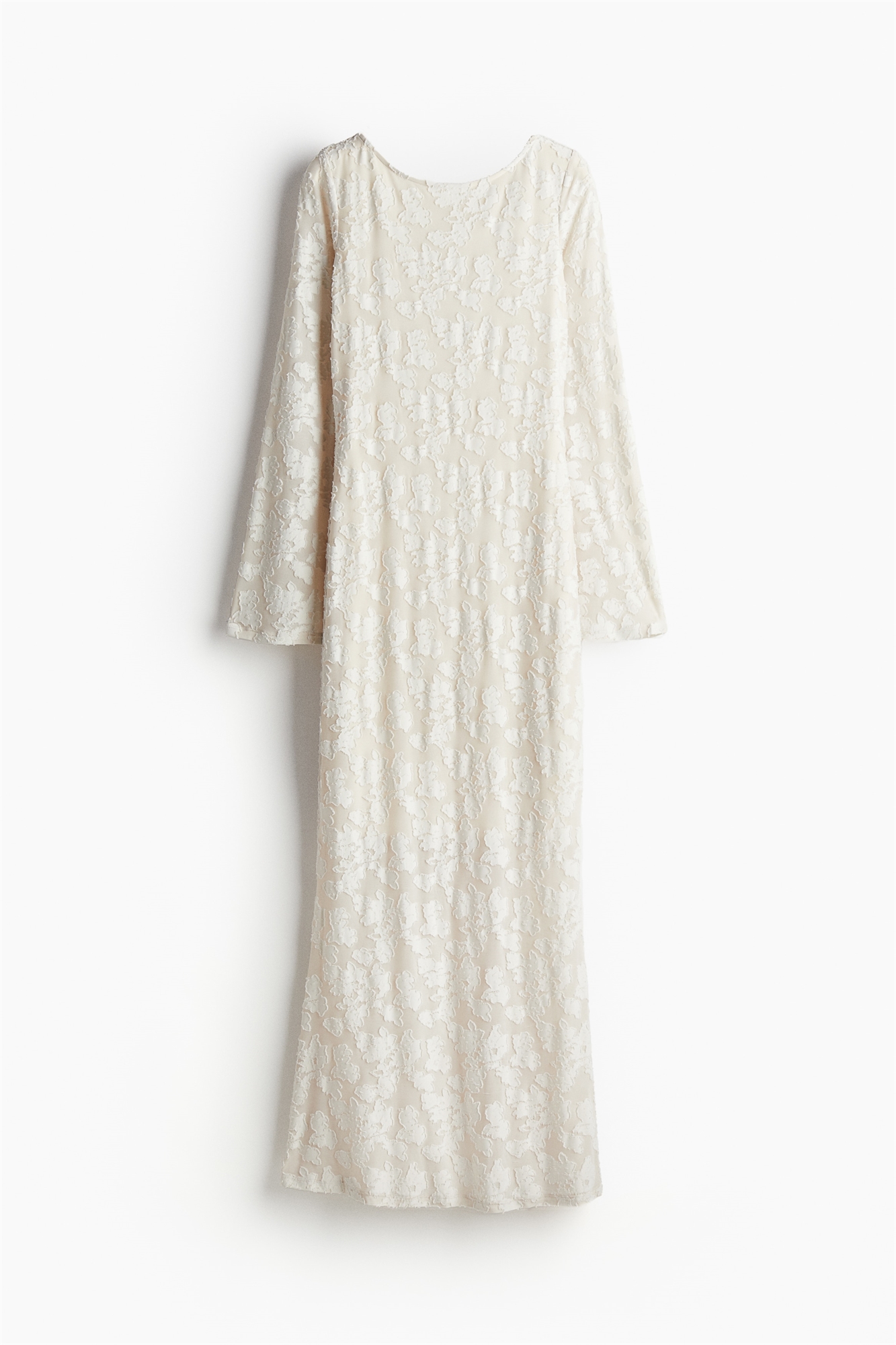 Длинное приталенное платье из цветочного жаккардового переплетения с нежным вырезом-лодочкой спереди и глубоким круглым вырезом сзади. Длинные рукава с мягкими расклешенными манжетами, юбка-русалка и прямой подол. Частично на подкладке.