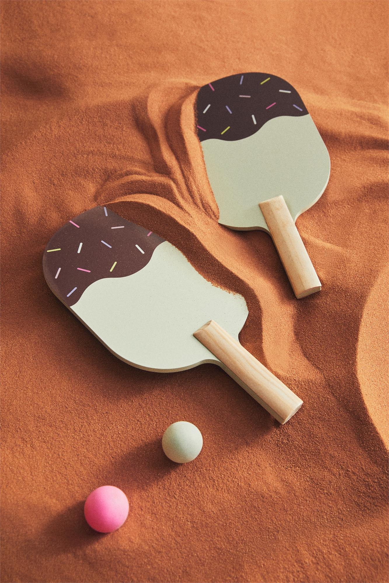 Устройте веселье на солнце с помощью этого набора для пляжного тенниса, состоящего из двух деревянных бит в форме ледяных леденцов и двух пластиковых мячей восхитительных пастельных оттенков.