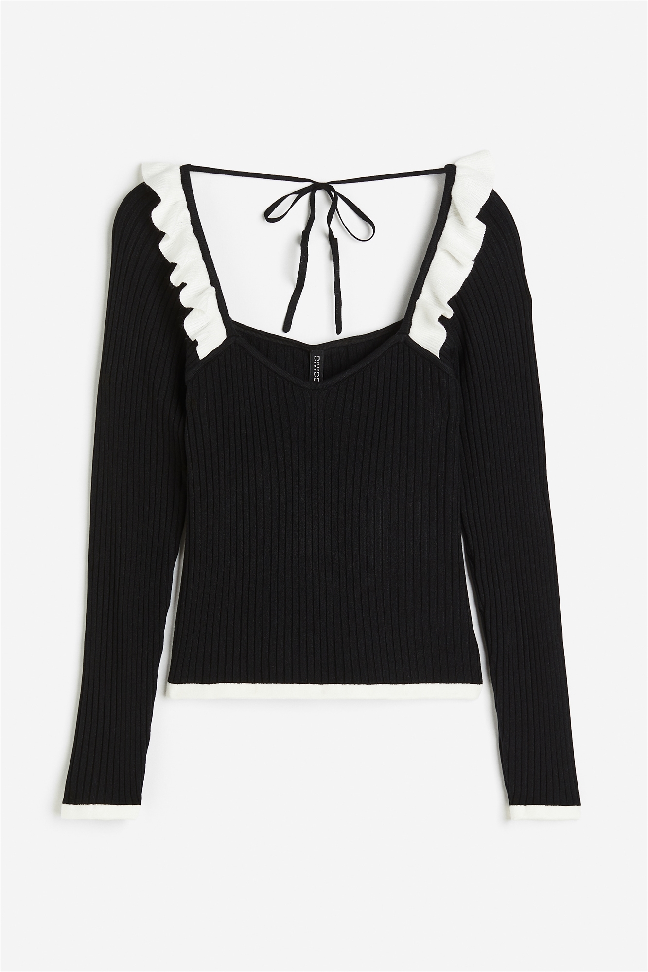 Облегающий топ из тонкого трикотажа в рубчик с вырезом "сердечко" спереди и квадратным вырезом с узкими завязками сзади. Оборка контрастного цвета на плечах, длинные рукава и прямой подол.