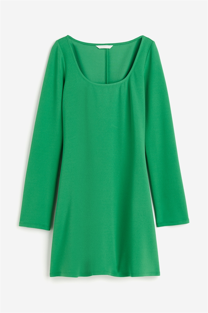 Короткое приталенное платье из эластичного джерси с глубоким квадратным вырезом и длинными, слегка расклешенными рукавами.