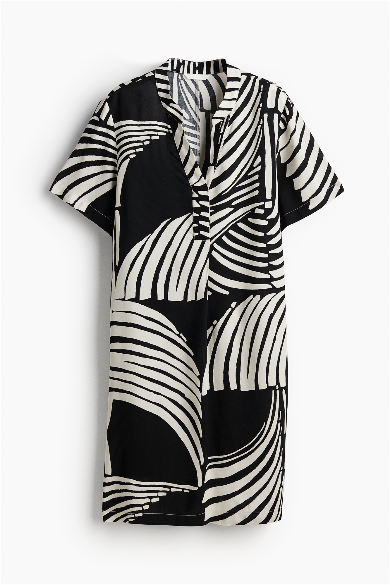 Платье-туника длиной до колена из воздушной вискозы с воротником-бантом и V-образной проймой спереди. Свободный крой, слегка спущенные плечи, короткие рукава и прямой подол с разрезом с каждой стороны. Немного длиннее сзади. Без подкладки.