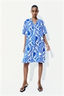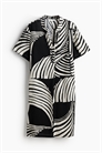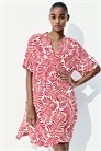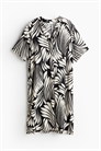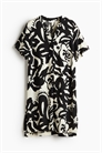 Платье-туника длиной до колена из воздушной вискозы с воротником-бантом и V-образной проймой спереди. Свободный крой, слегка спущенные плечи, короткие рукава и прямой подол с разрезом с каждой стороны. Немного длиннее сзади. Без подкладки.
