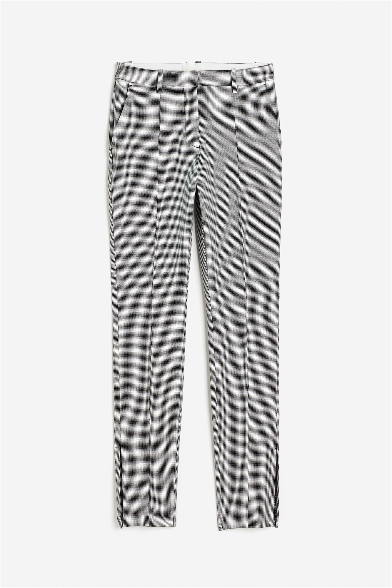 Приталенные брюки из тканого материала с высокой талией, ширинкой на молнии и потайной застежкой на пуговицы и крючки и глазки. Диагональные боковые карманы, втачные задние карманы и узкие зауженные ноги со складками спереди и сзади и разрезом на подоле.