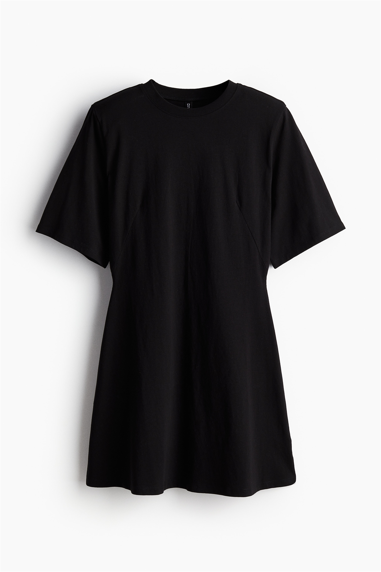 Короткое платье-футболка свободного кроя из мягкого хлопкового джерси с ребристой отделкой по вырезу горловины, подплечниками и прямым покроем подола.