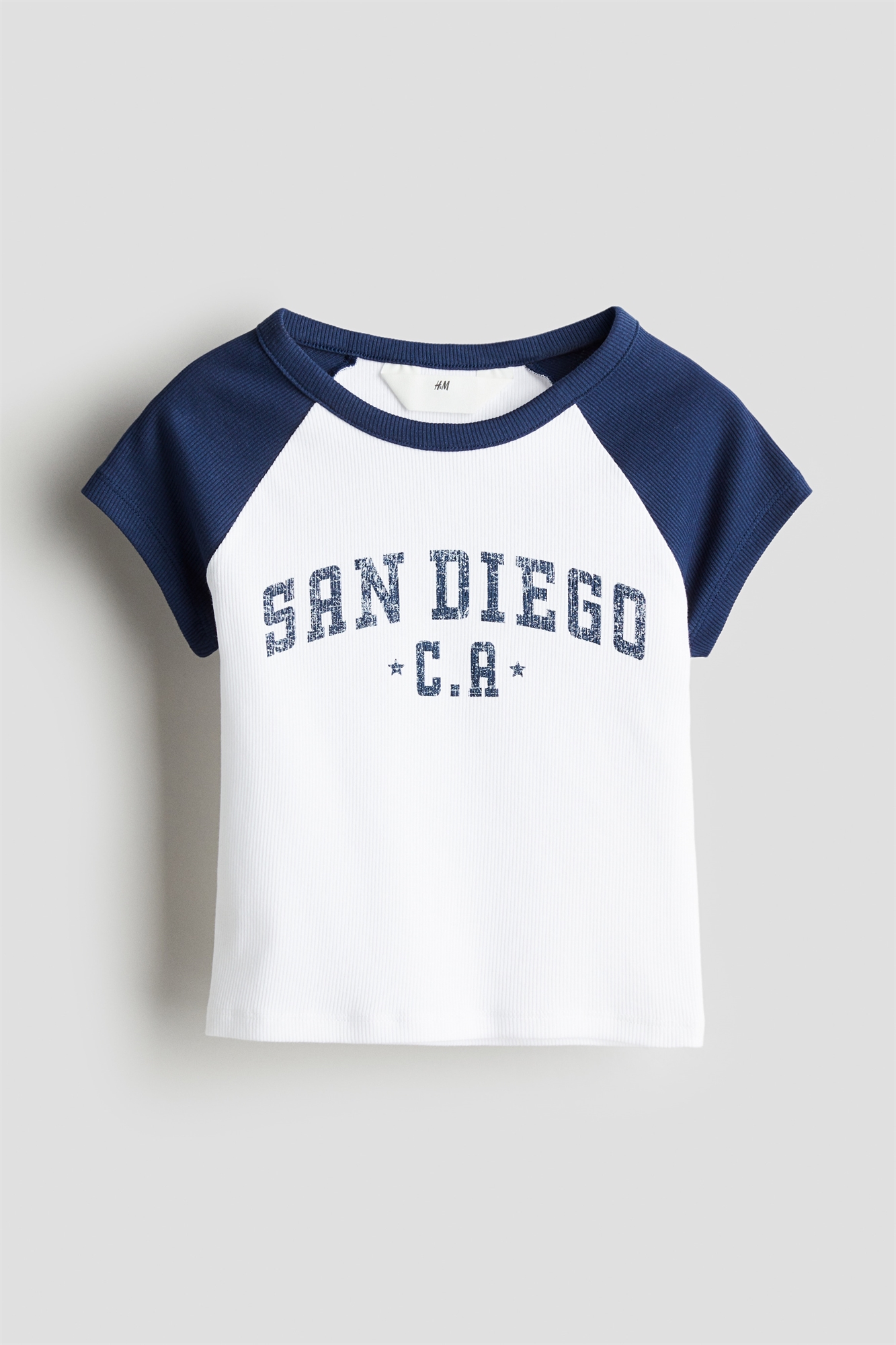 Футболка из принтованного ребристого трикотажа с круглым вырезом и прямым подолом.