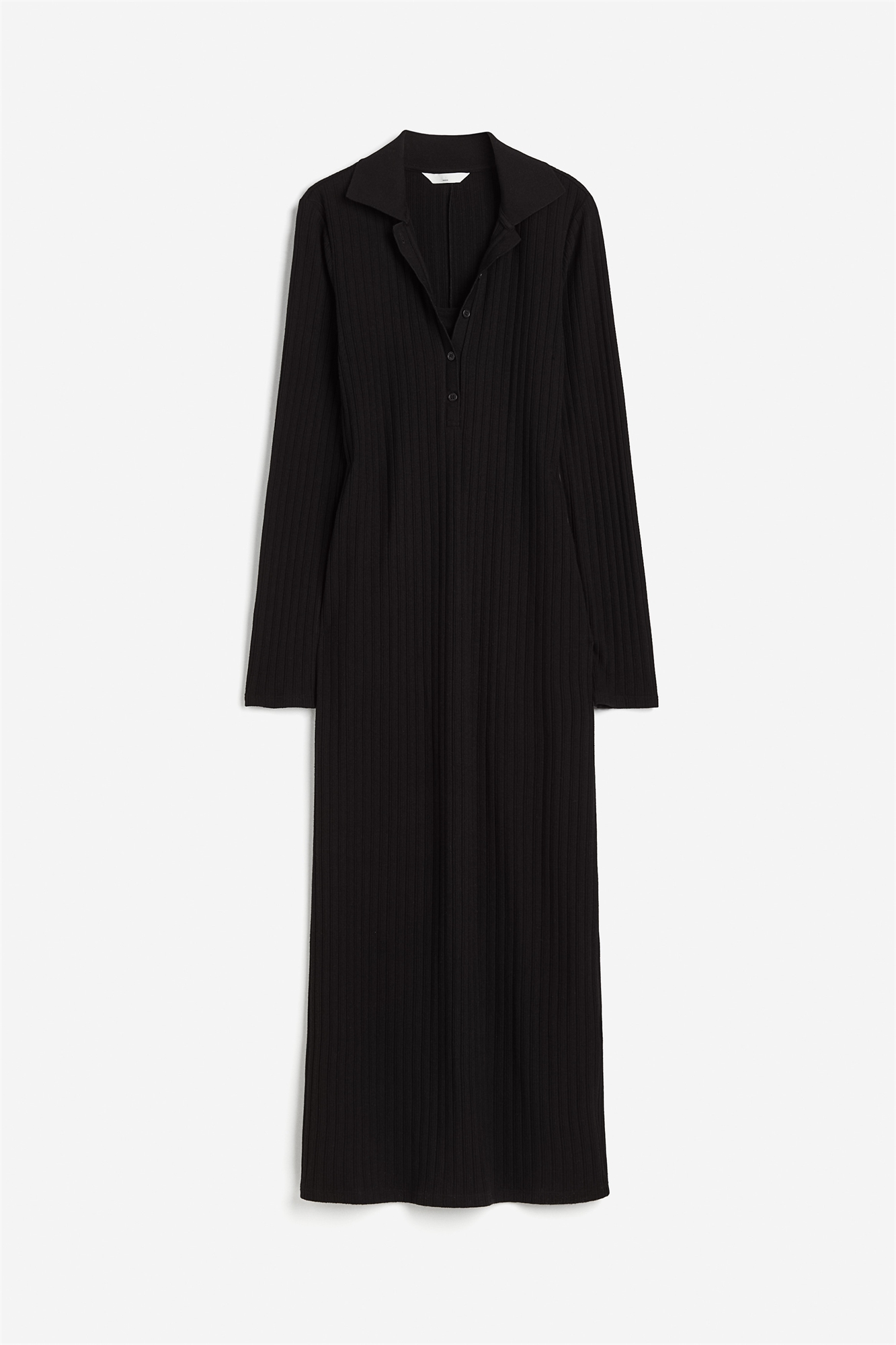 Платье для кормящих длиной до щиколотки из ребристого трикотажа с воротником, пуговицами в верхней части, длинными рукавами и разрезом сзади. Конструкция предусматривает двойной слой в верхней части, который помогает сохранить тепло и облегчает доступ к груди.