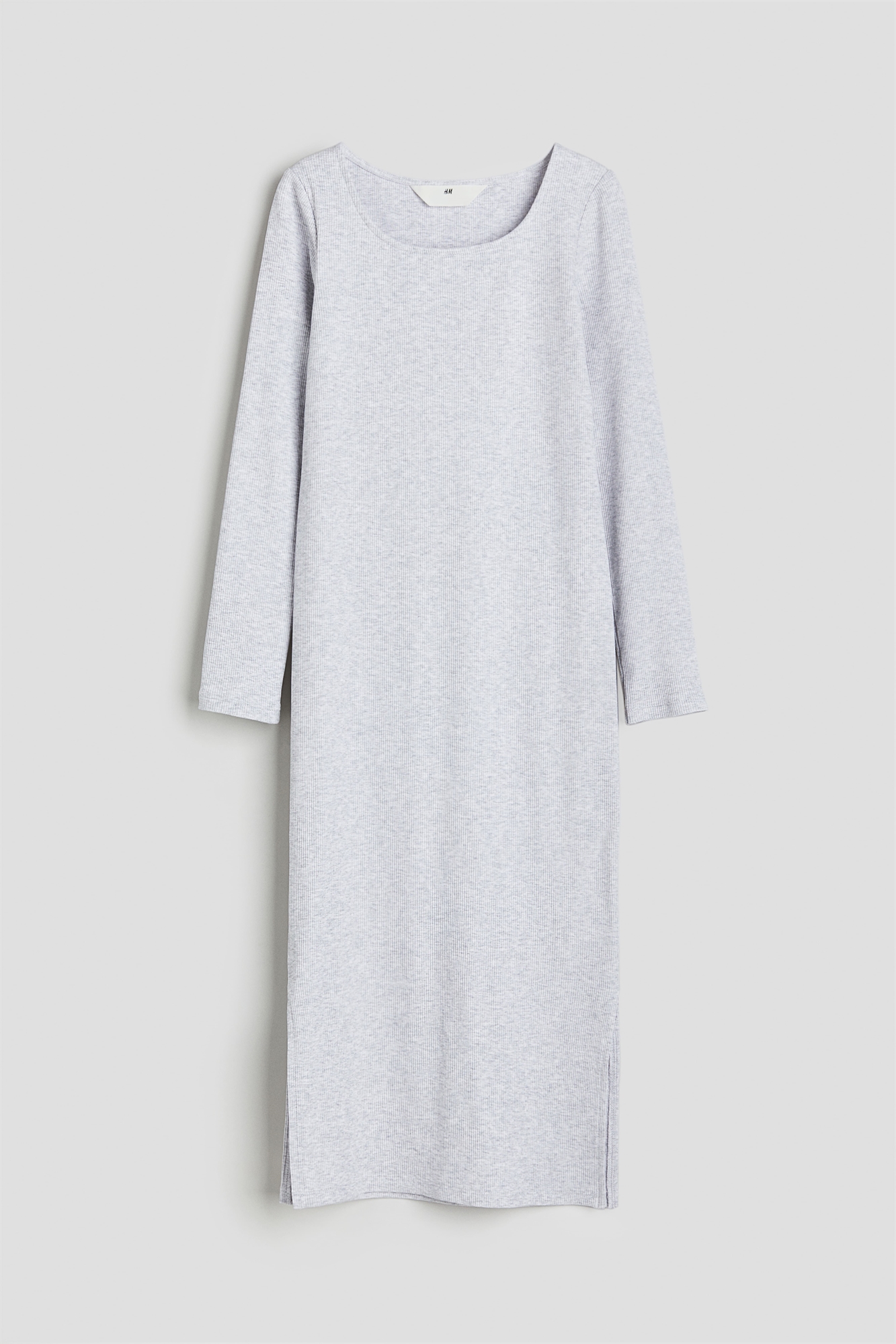 Платье длиной до колена из ребристого трикотажа с квадратным вырезом, длинными рукавами и прямым подолом с разрезом с одной стороны.