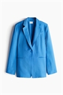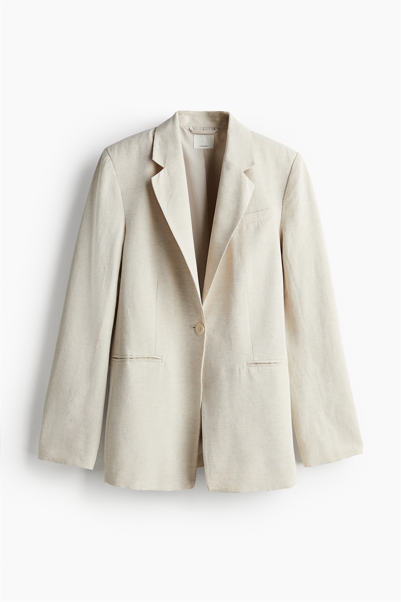 Однобортный блейзер из тканого материала, изготовленного из смеси льна. Лацканы с вырезом, застежка на одну пуговицу спереди, подплечники и длинные рукава. Накладной карман на груди и втачные передние карманы. На подкладке.