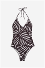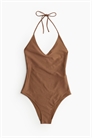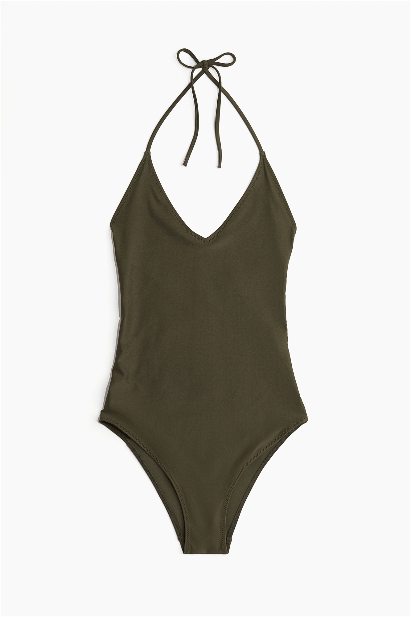 Полностью на подкладке, купальник с V-образным вырезом горловины, завязками и низким разрезом сзади. Вырез на спине.