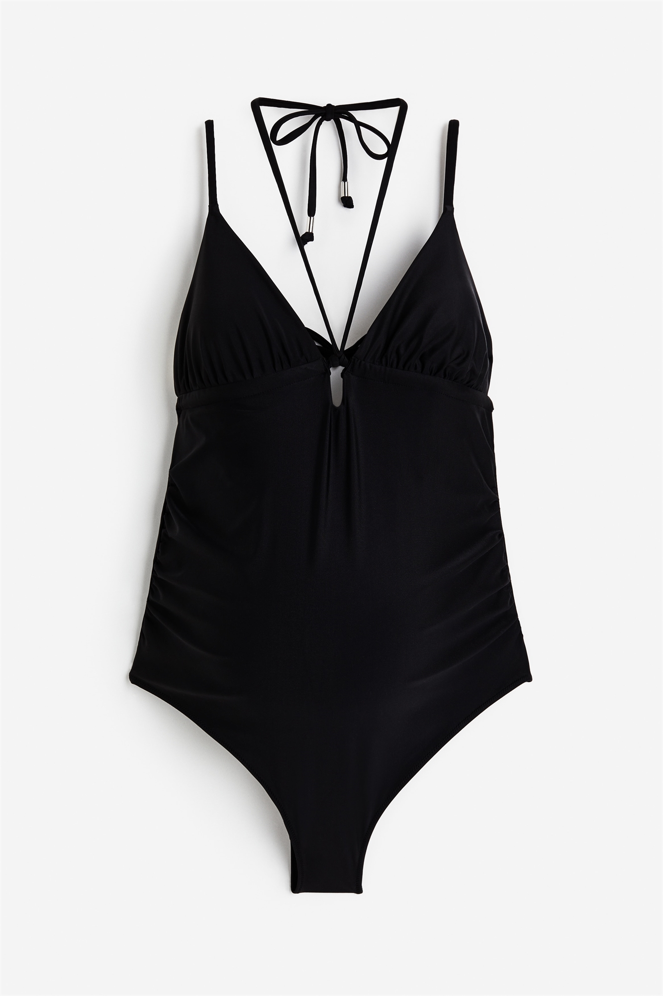 Полностью на подкладке, купальник с V-образным вырезом, регулируемыми бретелями, узкой эластичной вставкой под бюстом и чашечками со съемными вкладышами, придающими форму бюсту и обеспечивающими хорошую поддержку. Завязки на груди и глубокий круглый вырез сзади с горизонтальными завязками. Сборки по бокам для лучшей посадки на животе. Средняя степень защиты сзади.