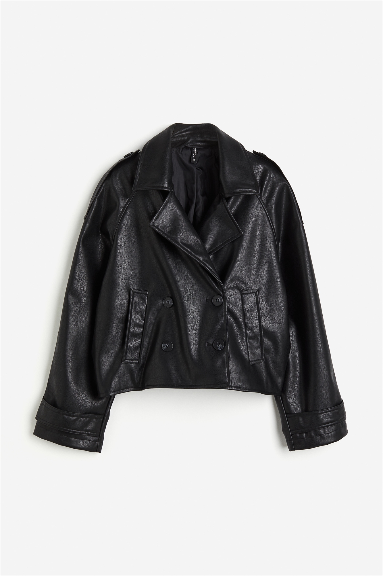 Двубортный пиджак из ткани с покрытием. Воротник, лацканы, погоны и свободный крой. Косые прорезные карманы спереди и рукава реглан с застежками на пуговицах. На подкладке.