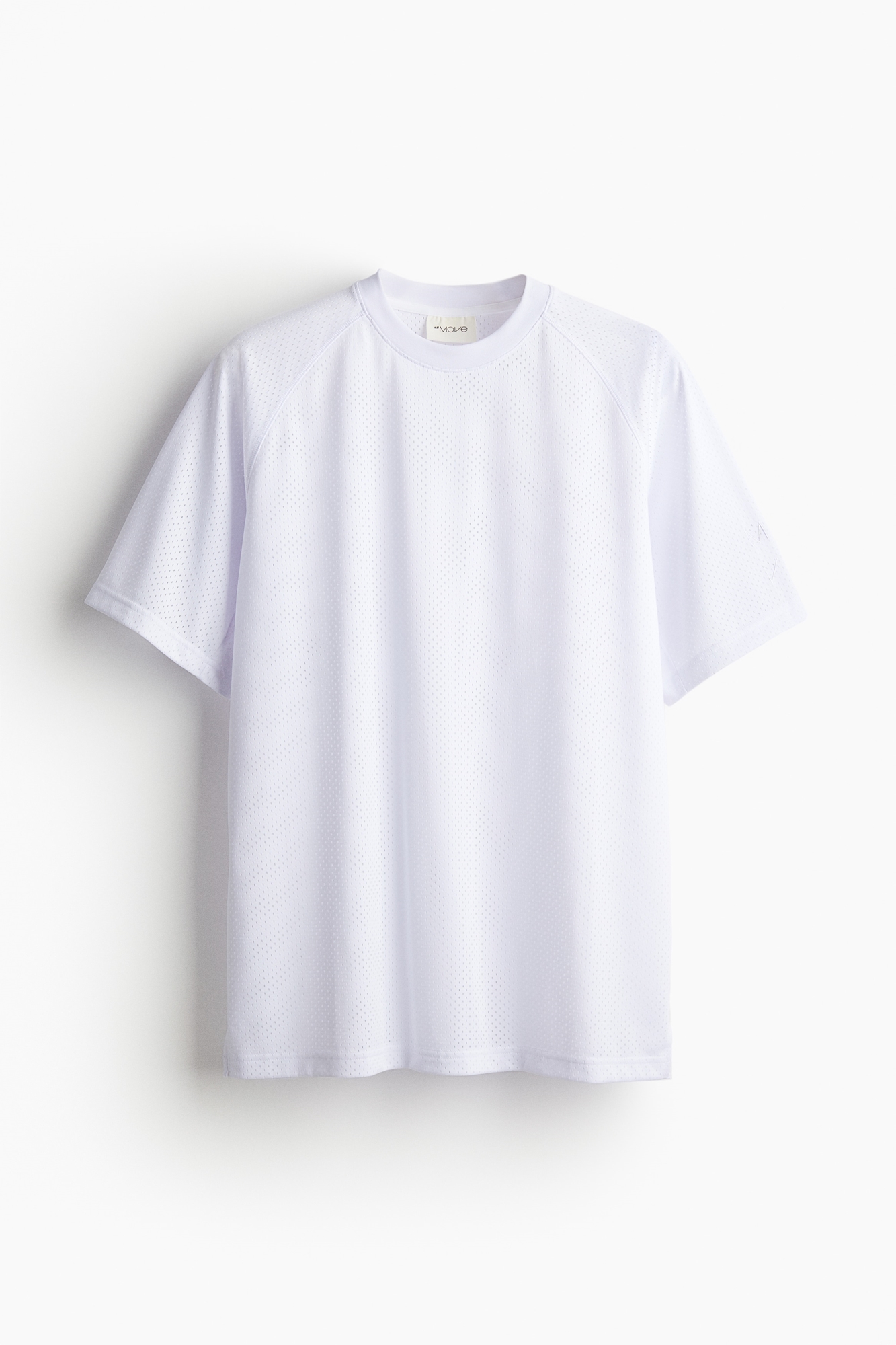 Спортивная футболка из сетки DryMove™, которая помогает отводить влагу от кожи, обеспечивая комфортную сухость во время движения. Свободный крой с окантовкой в рубчик, рукава реглан и прямой подол с небольшим разрезом с каждой стороны.