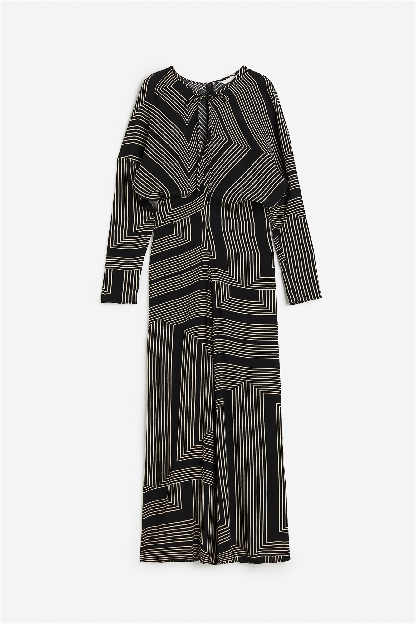 Платье длиной до колена из креповой ткани с круглым вырезом и проймой спереди с узкими завязками вверху. Свободный лиф, спущенные плечи и длинные приталенные рукава. Скрытая застежка-молния сзади, зауженная талия и расклешенная юбка. Без подкладки.