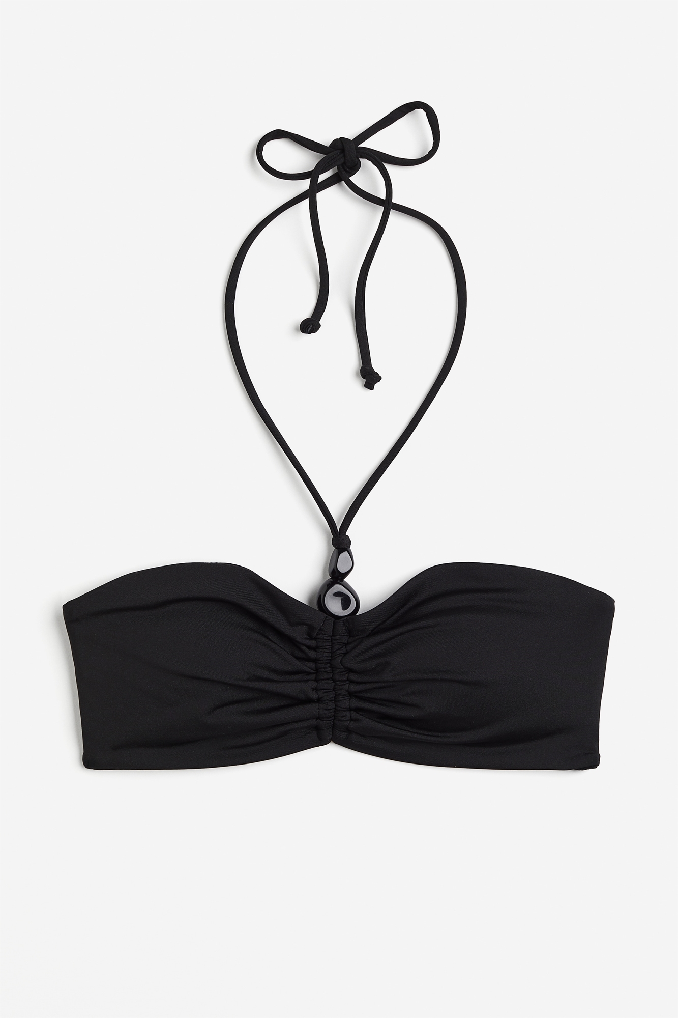Бикини-бандо на подкладке с чашечками со съемными вставками, которые формируют бюст и обеспечивают хорошую поддержку. Украшенный бисером шнурок завязывается сзади на шее. Без застежек.