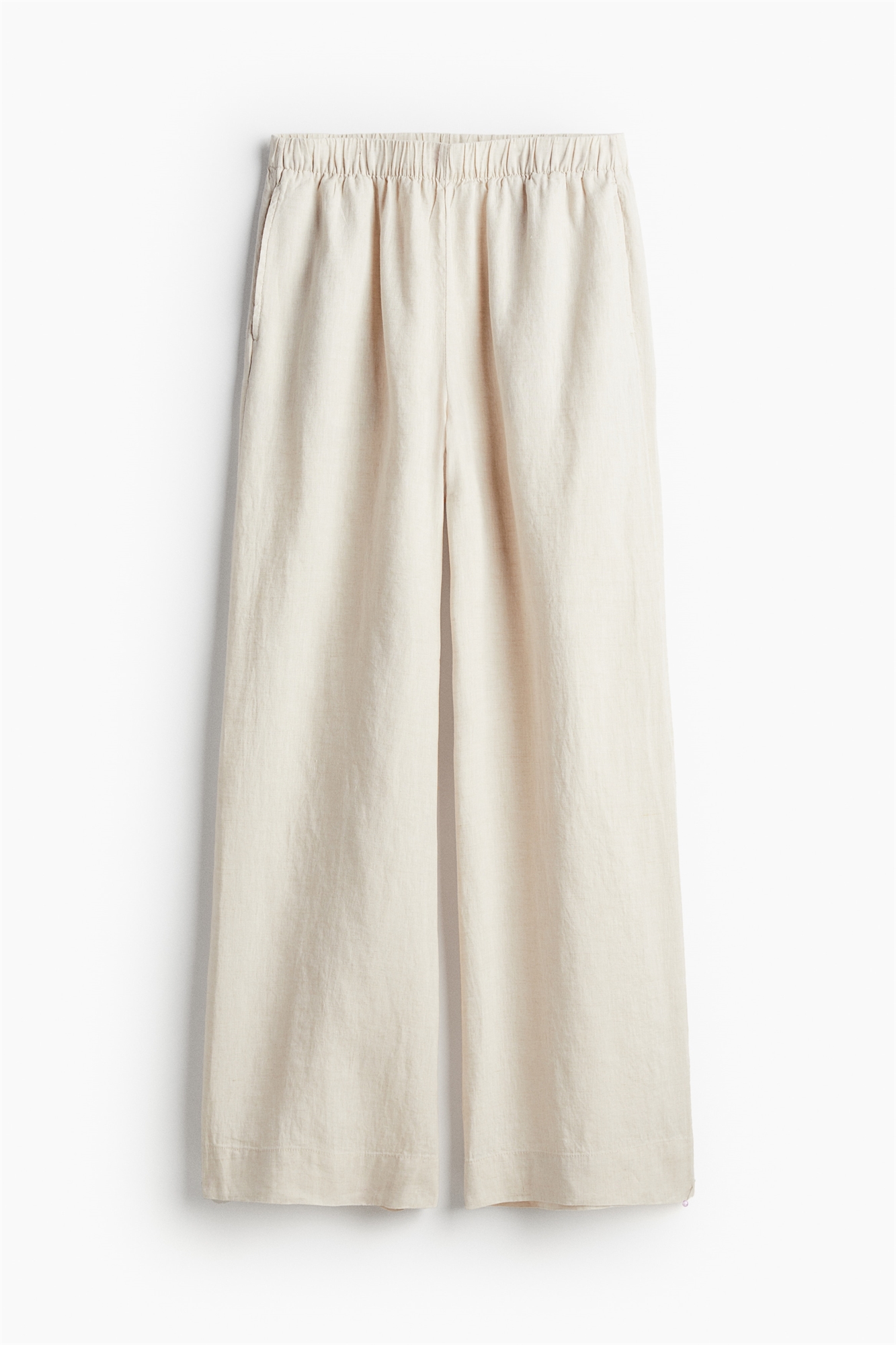 Свободные брюки из воздушного льна с высоким эластичным поясом, неброскими боковыми карманами и широкими штанинами.